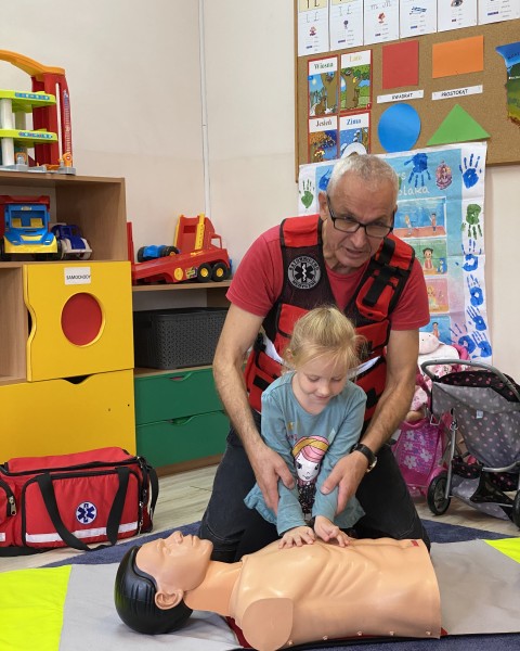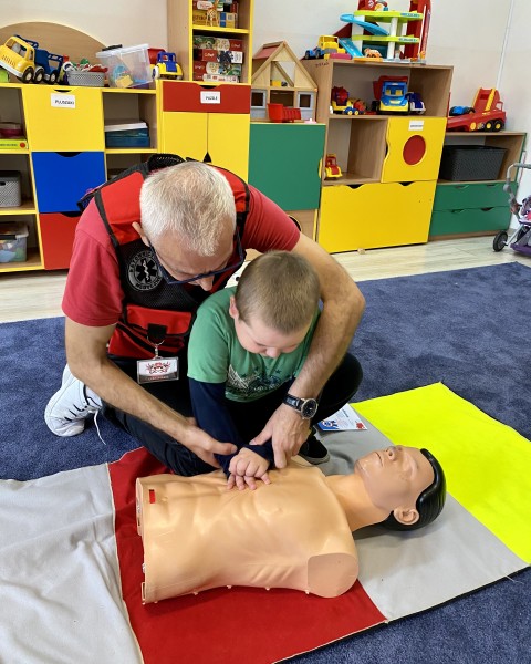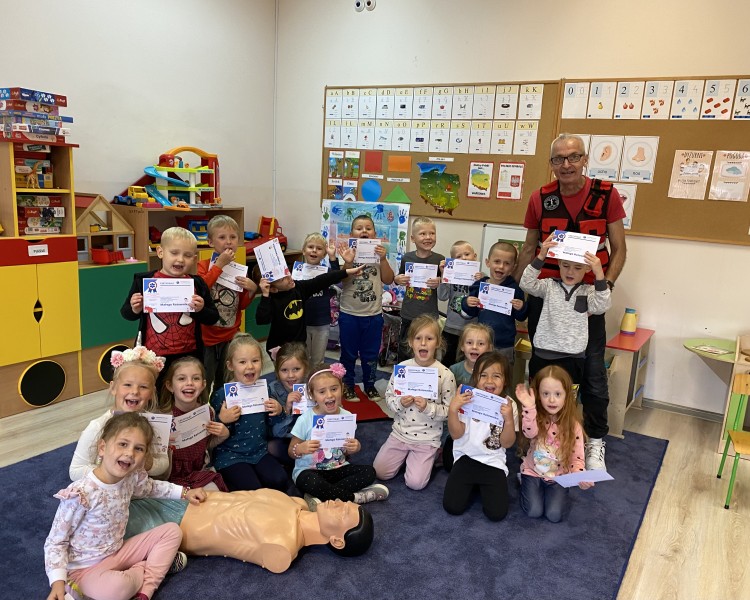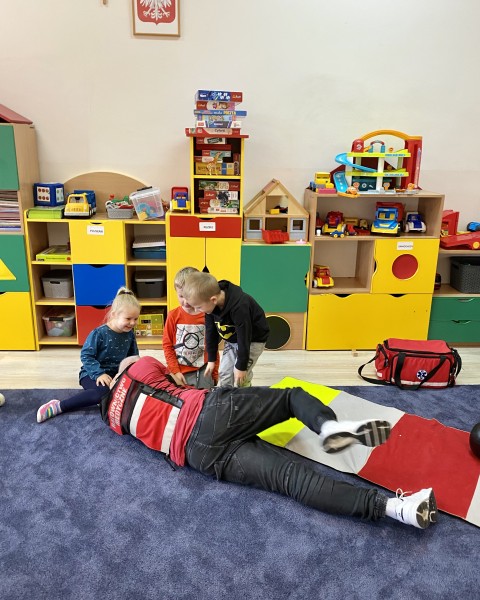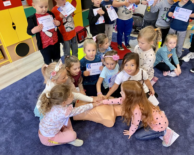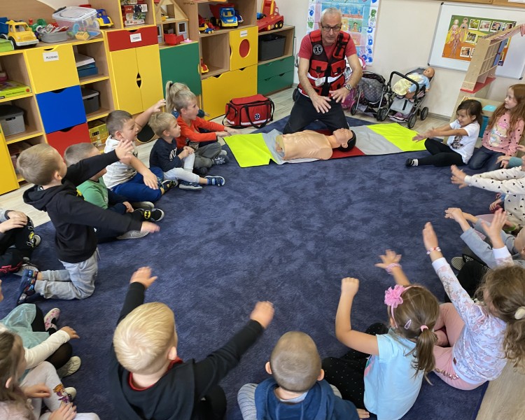 Celem zajÄÄ byĹo przygotowanie przedszkolakĂłw do wykonywania prostych czynnoĹci udzielania pierwszej pomocy oraz prawidĹowego zachowania siÄ w czasie wypadku, w sytuacjach zagroĹźenia Ĺźycia lub zdrowia.