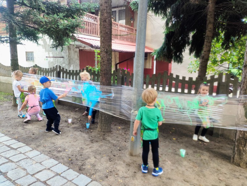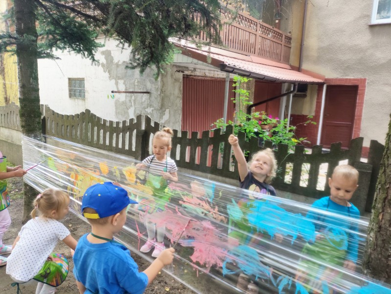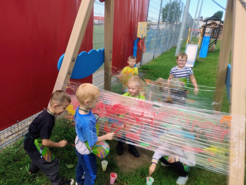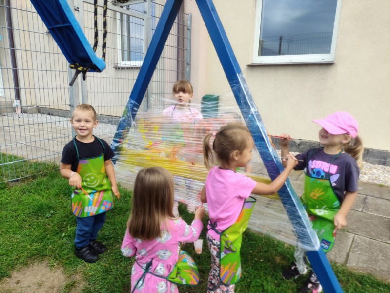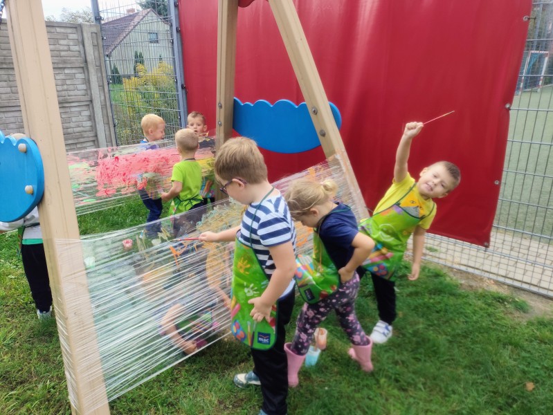 Mali artyĹci mieli moĹźliwoĹÄ zdobyÄ nowe doĹwiadczenie, podczas wspĂłlnego malowania farbami na folii stretch umieszczonej miÄdzy drzewami i sprzÄtami na przedszkolnym placu zabaw. Podczas aktywnoĹci doskonaliliĹmy motorykÄ maĹÄ , koordynacjÄ wzrokowo-ruchowÄ , stymulowaliĹmy zmysĹy, rozwijaliĹmy kreatywnoĹÄ i wyobraĹşniÄ, a takĹźe umiejÄtnoĹci wspĂłĹpracy w grupie rĂłwieĹniczej.
