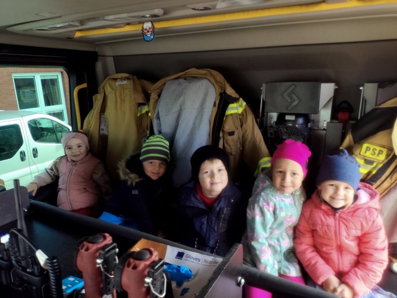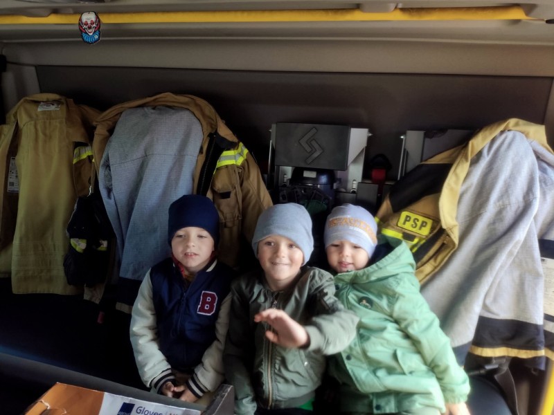 Przybyli na miejsce prĂłbnego alarmu przeciwpoĹźarowego straĹźacy z Komendy Powiatowej StraĹźy PoĹźarnej w Ostrowie Wielkopolskim zaprosili nas do wozu straĹźackiego đ. Dzieci byĹy zachwycone ;)