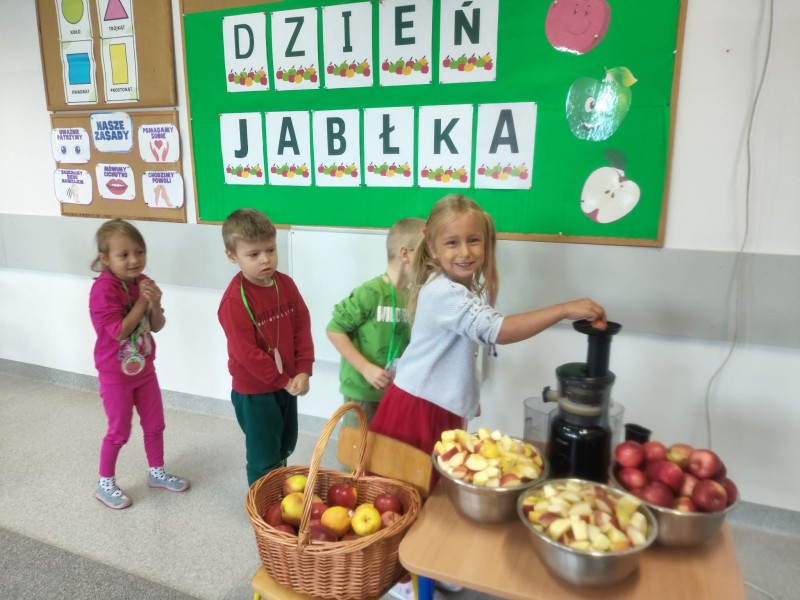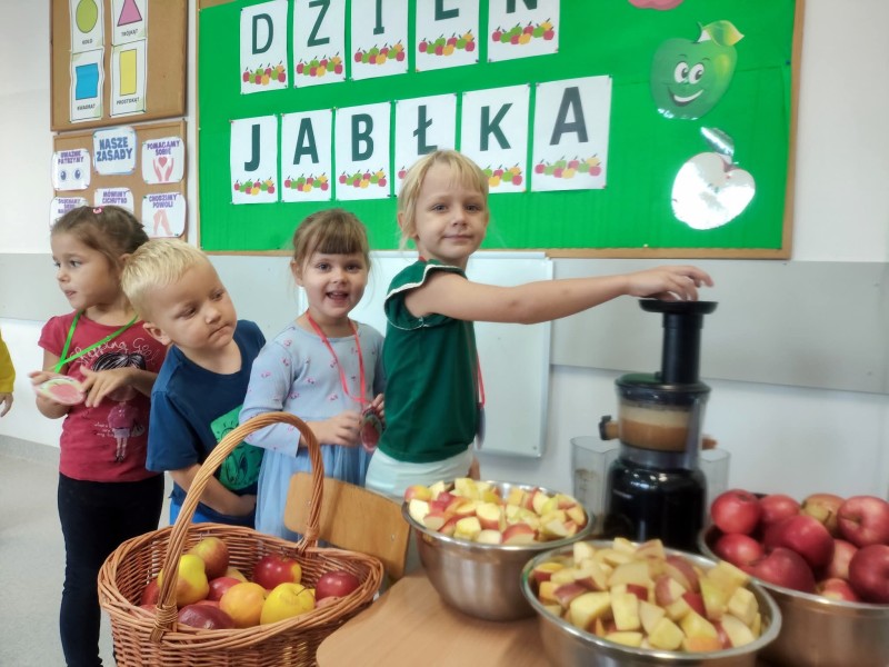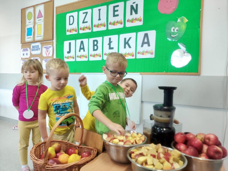 Dzieci samodzielnie przygotowaĹy przepyszny, zdrowy sok jabĹkowy, ktĂłry z apetytem wypiĹy. Dzieci miaĹy okazjÄ skosztowaÄ pysznych i soczystych jabĹuszek oraz jabĹkowych produktĂłw i przetworĂłw - musu i jabĹek suszonych.