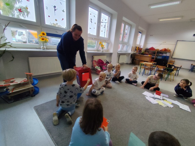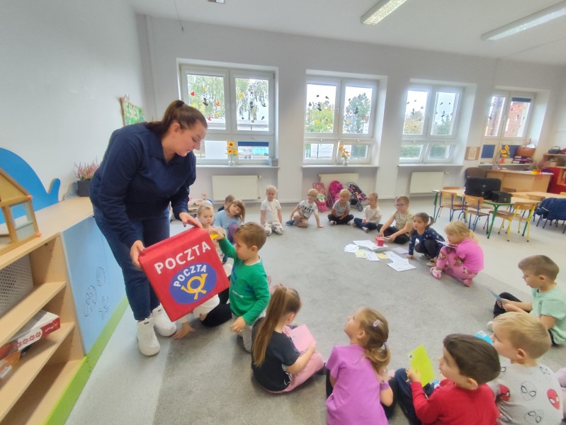 Bratki dowiedziaĹy siÄ, czym na co dzieĹ zajmuje siÄ listonosz i jak wyglÄ da jego praca. Pani Kamila zaprezentowaĹa swĂłj strĂłj, torbÄ na listy, skrzynkÄ pocztowÄ oraz róşne rodzaje listĂłw, przesyĹki polecone oraz paczki pocztowe. Dzieci miaĹy moĹźliwoĹÄ potwierdziÄ odbiĂłr listu swoim podpisem na specjalnym tablecie oraz przykleiÄ na zaadresowanej kopercie prawdziwy znaczek pocztowy đ. Wszystkie dzieci wrzuciĹy swoje listy do skrzynki pocztowej, a Pani listonosz zawiozĹa je do UrzÄdu Pocztowego - kaĹźdego dnia sprawdzajcie swoje skrzynki na listy - niebawem pojawi siÄ w nich niespodzianka đ