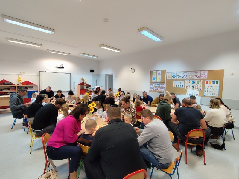 Dzieci i rodzice wspĂłlnymi siĹami przygotowali jesienne szyciaki – kolorowe maskotki, ktĂłre dzieci zabraĹy ze sobÄ do domu jako pamiÄ tkÄ wspĂłlnej pracy.