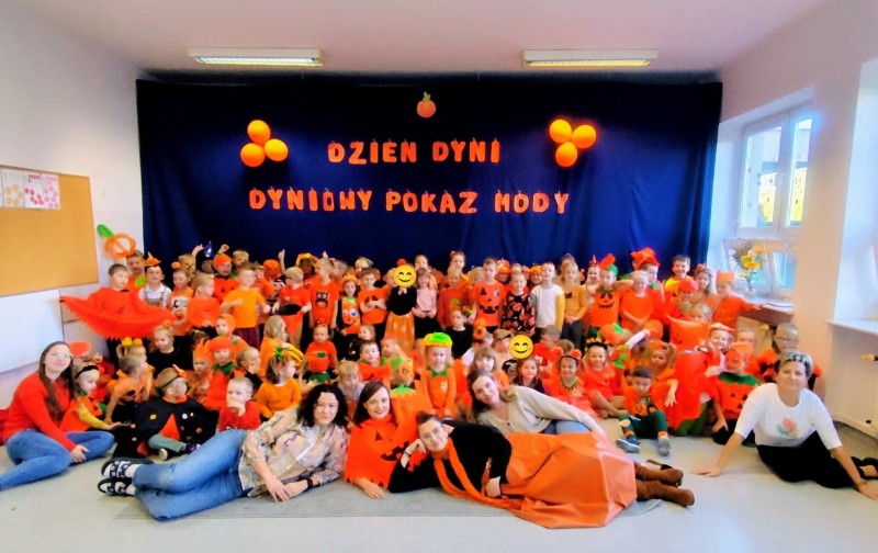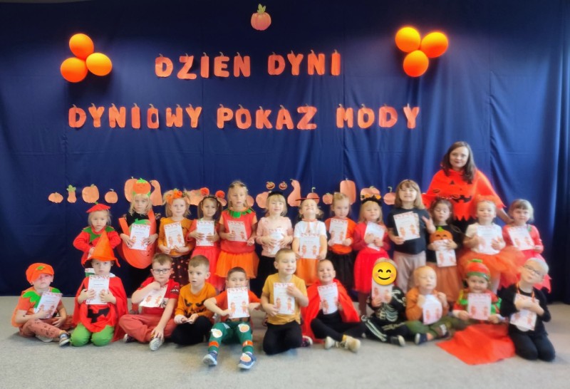 Po pokazie wszystkie dzieci zebraĹy siÄ na pamiÄ tkowe zdjÄcie – uĹmiechniÄte twarze, pomaraĹczowe akcenty i jesienne dekoracje stworzyĹy magicznÄ kompozycjÄ.