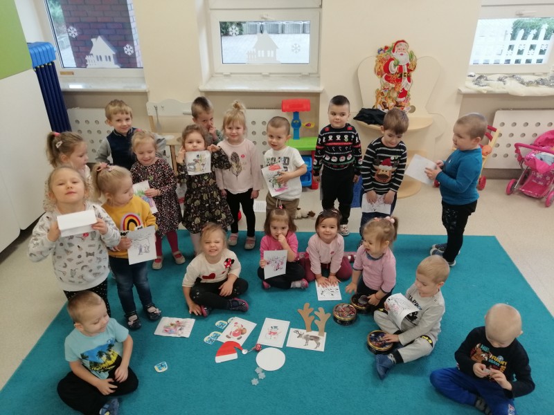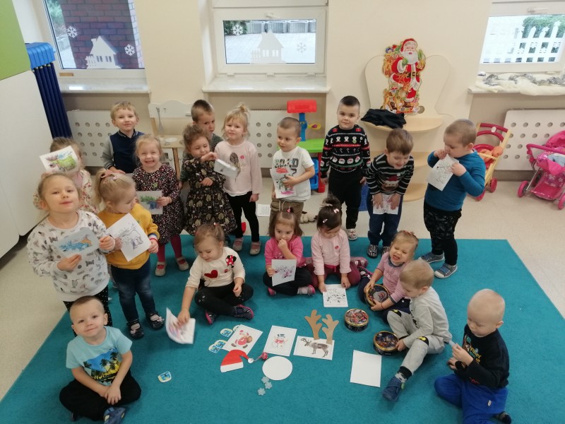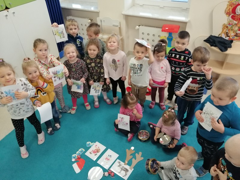 Ostatnio na zajÄciach z j. angielskiego poznawaliĹmy sĹownictwo zwiÄ zane z ĹwiÄtami BoĹźego Narodzenia. Dzieci wyciÄ gaĹy ukryte w skarpcie i puszkach obrazki, pĹatki Ĺniegu, dzwoneczki, nazywaliĹmy je a takĹźe przeliczaliĹmy. Maluszki na koniec zaĹpiewaĹy piosenkÄ oraz pokolorowaĹy obrazek renifera.