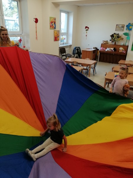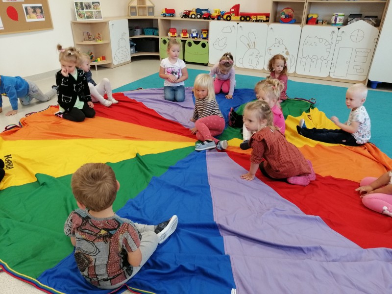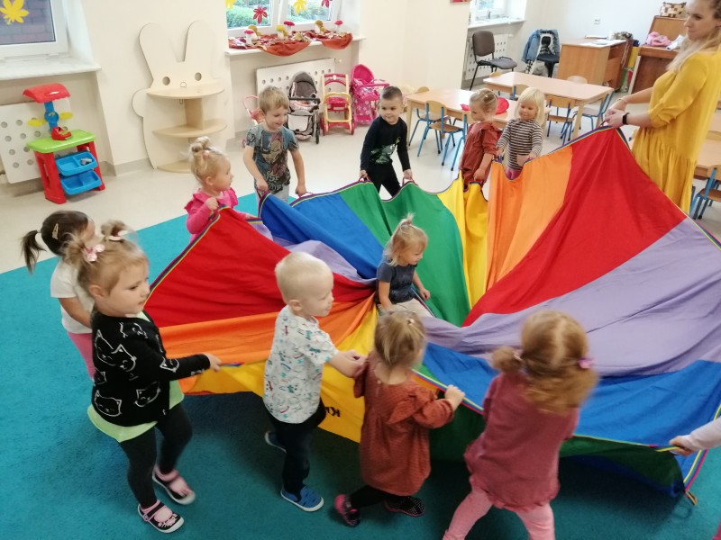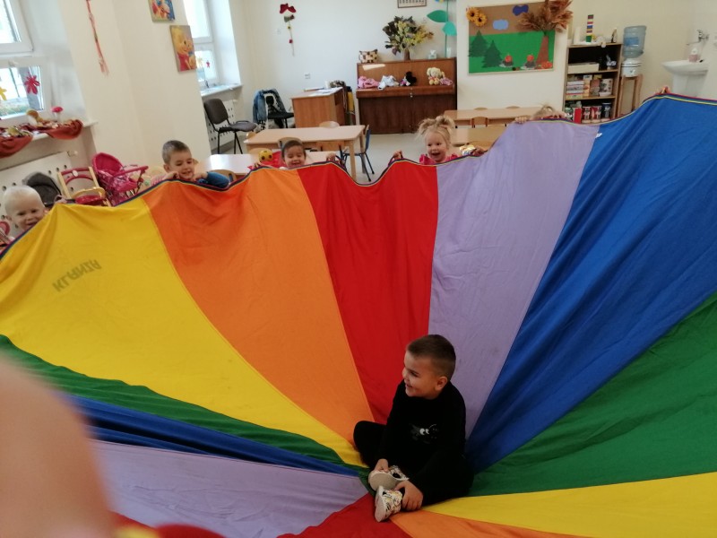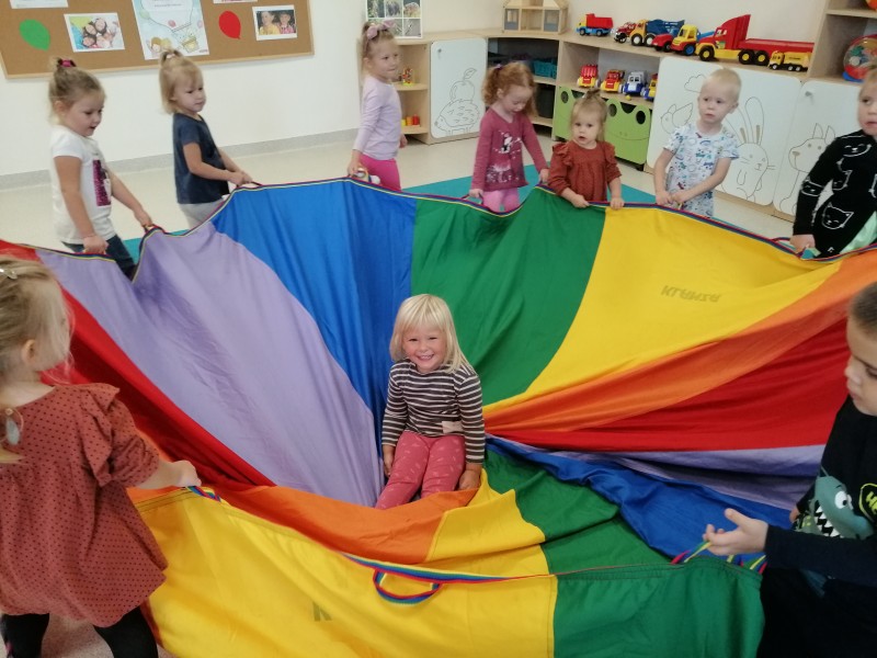 Stasiu W., Julka, Matylda i Maja odwaĹźyli siÄ usiaĹÄ na chuĹcie. W tym czasie Bratki zakrÄciĹy chustÄ wokóĹ nich. Dzieciom bardzo podobaĹa siÄ zabawa!