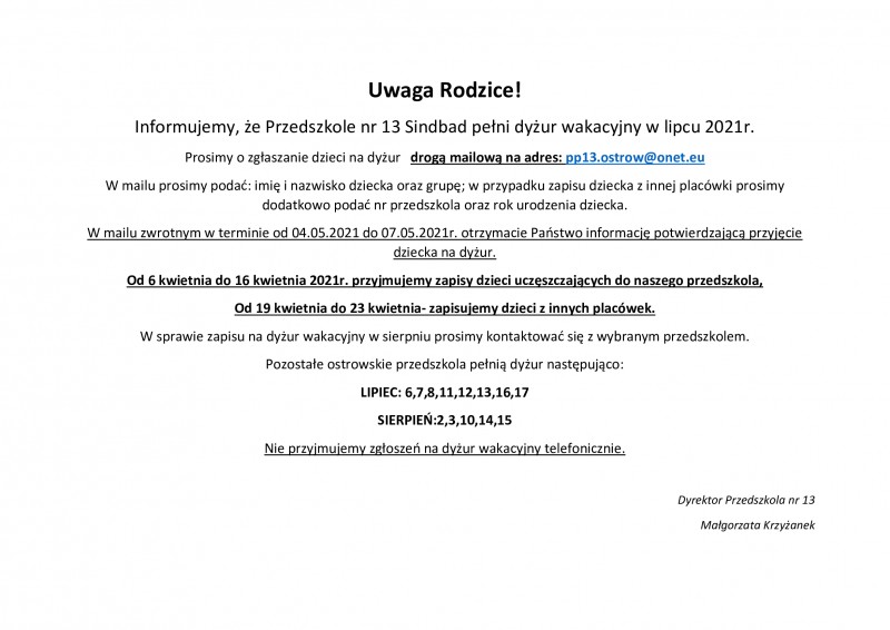Informacja odnoĹnie dyĹźuru wakacyjnego