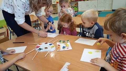 podczas omawiania jesiennych tematĂłw malowaliĹmy farbkami kwiatki oraz wykonywaliĹmy stempelki z ziemniakĂłw.
