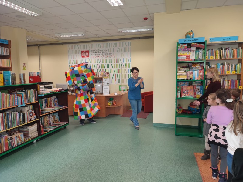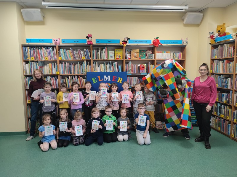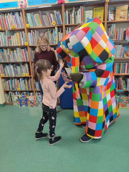 29 marca grupa FIOĹKI wybraĹa siÄ do Biblioteki Publicznej nr 7 na zajÄcia i spotkanie ze sĹoniem w kratkÄ ELMEREM, ktĂłry jest bohaterem popularnych opowieĹci dla dzieci autorstwa Davida McKee'a
