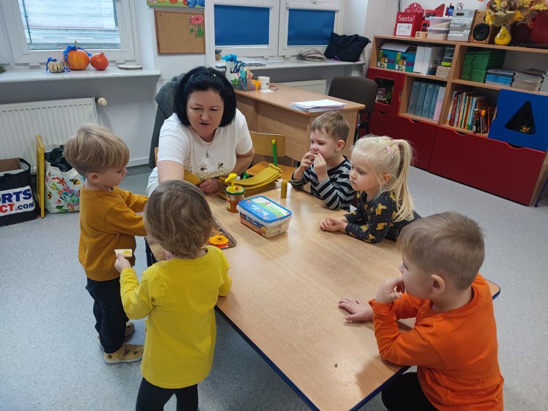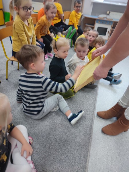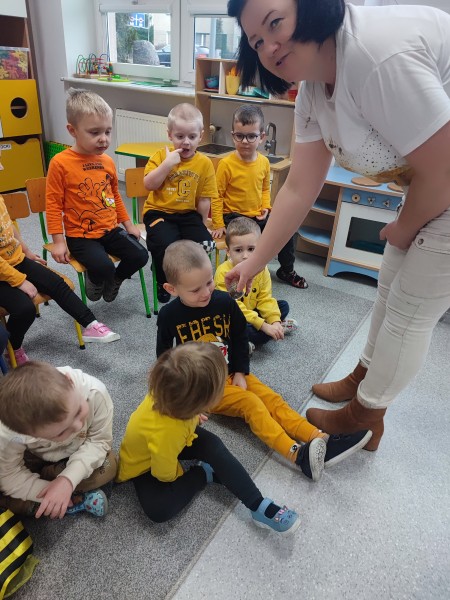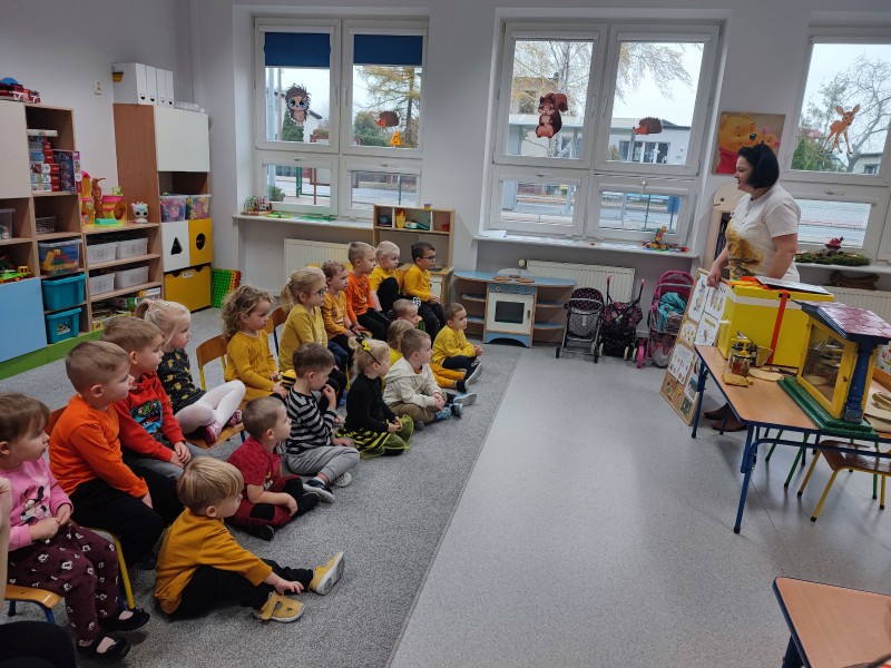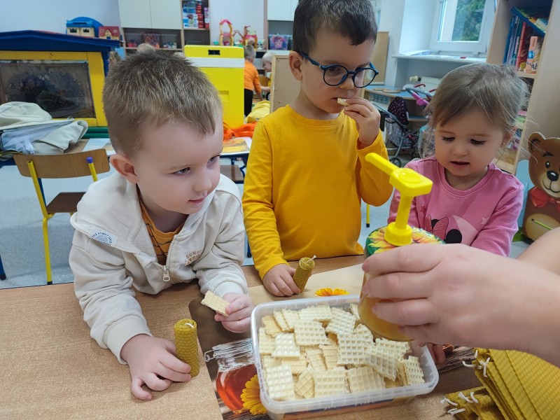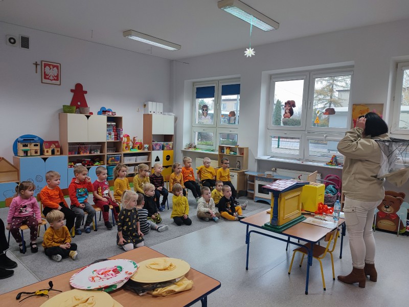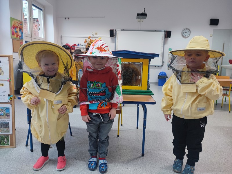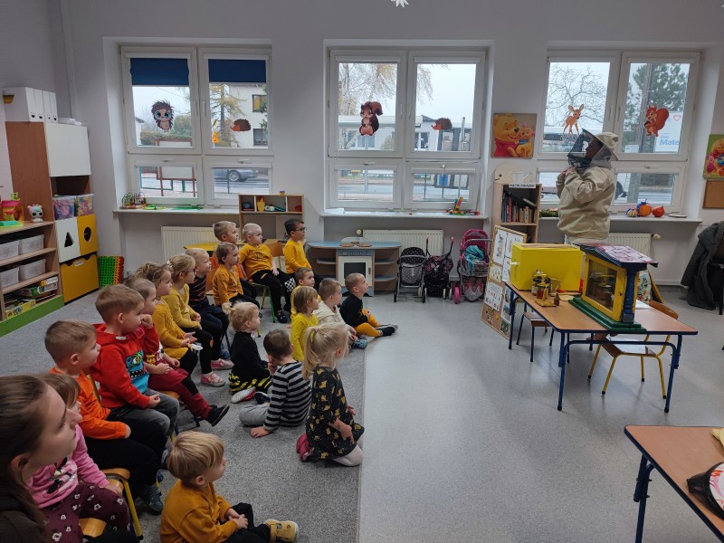 Wizyta pani Pszczelarz Ilony w przedszkolu w dniu 23 listopada wywoĹaĹa na dzieciach wiele wraĹźeĹ. Bardzo dziÄkujÄ rodzicom Stasia za zaangaĹźowanie i zaĹatwienie bardzo ciekawych zajÄÄ, ktĂłre umoĹźliwiĹy dzieciom poznanie pracy pszczelarza i przyjrzenia siÄ z bliska Ĺźyciu tych niezwykĹych owadĂłw. Maluszki na zajÄciach mogĹy rĂłwnieĹź poprĂłbowaÄ miĂłd oraz wykonaÄ pracÄ plastycznÄ - ĹwiecÄ z plastrĂłw miodu, ktĂłrÄ zabrali do domu.