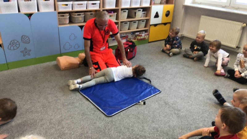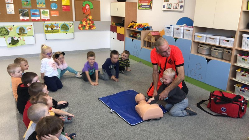 Celem zajÄÄ byĹo zapoznanie dzieci z podstawowymi czynnoĹciami ratowniczymi w przypadku nieobecnoĹci osĂłb dorosĹych dzieci z zainteresowaniem sĹuchaĹy wskazĂłwek pana ratownika dotyczÄ cych zachowania siÄ w sytuacji zagroĹźenia Ĺźycia, nauczyĹy siÄ podstawowych numerĂłw alarmowych oraz jak wezwaÄ pomoc przez telefon. DuĹźe wraĹźenie na przedszkolakach zrobiĹ " fantom ", na ktĂłrym dzieci uczyĹy siÄ podstaw reanimacji.