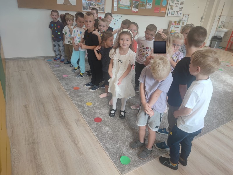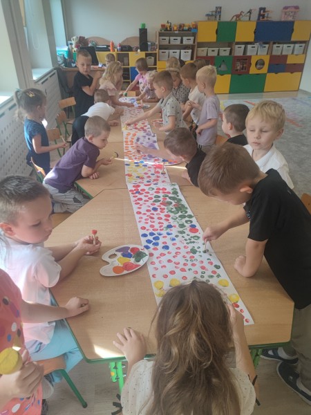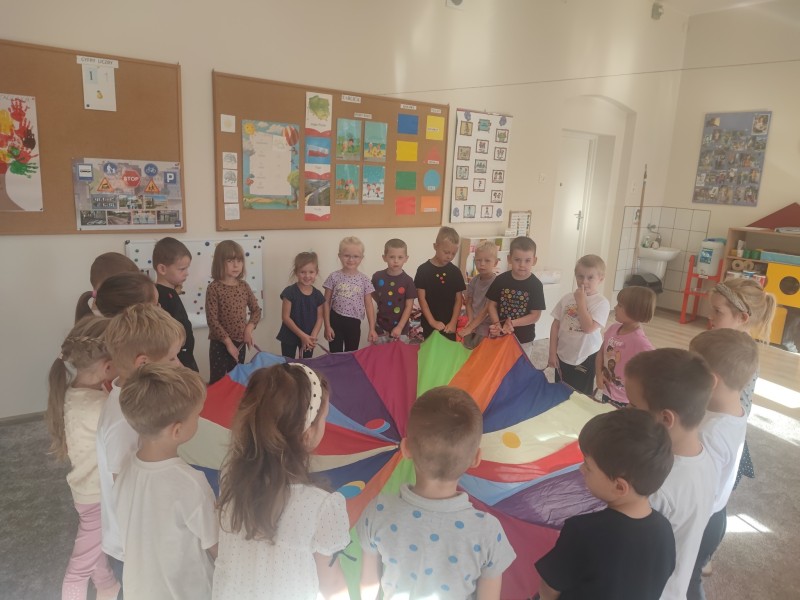 WspĂłlnie bawiliĹmy siÄ z chustÄ animacyjnÄ , a nastÄpnie wykonaliĹmy pracÄ plastycznÄ pt. „Kropkowy dywan”. ByĹ to dzieĹ peĹen radoĹci, kolorĂłw i pomysĹowoĹci.