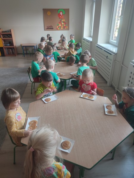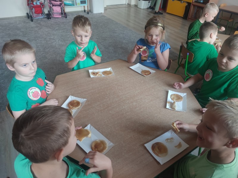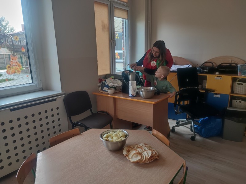 NastÄpnie grupa FioĹki przygotowywaĹa pyszny mus jabĹkowy w thermomiksie. KaĹźde dziecko mogĹo dorzuciÄ potrzebne skĹadniki i zobaczyÄ, jak powstaje zdrowy deser. Na zakoĹczenie wszyscy z apetytem zajadali naleĹniki z musem jabĹkowym.
