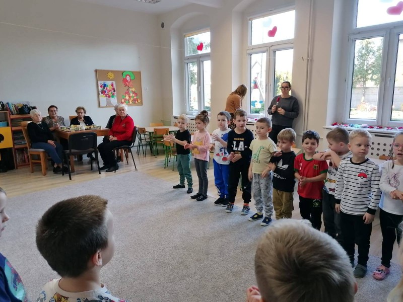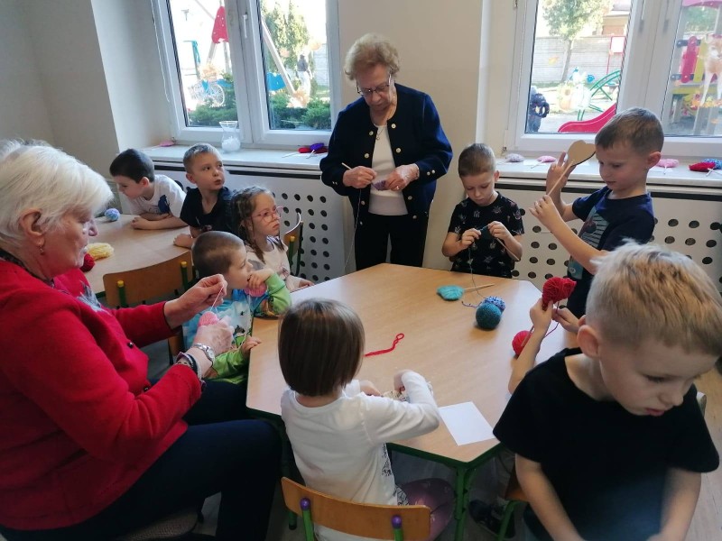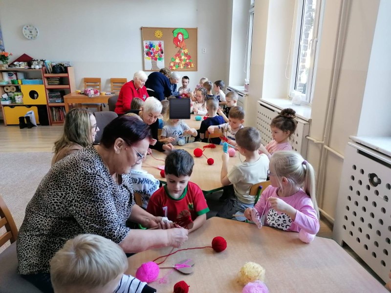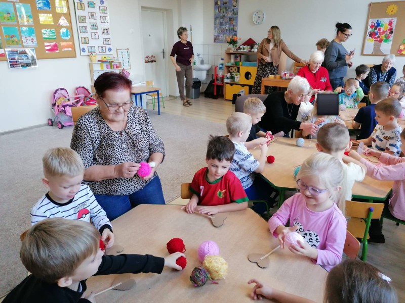 Dzieci z grupy FioĹki wspĂłlnie z goĹÄmi przygotowywaĹy upominki na DzieĹ Babci i Dziadka – kolorowe serduszka na patyczku ozdobione weĹnÄ