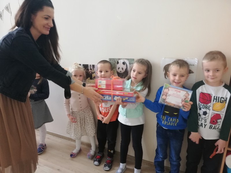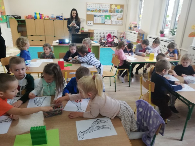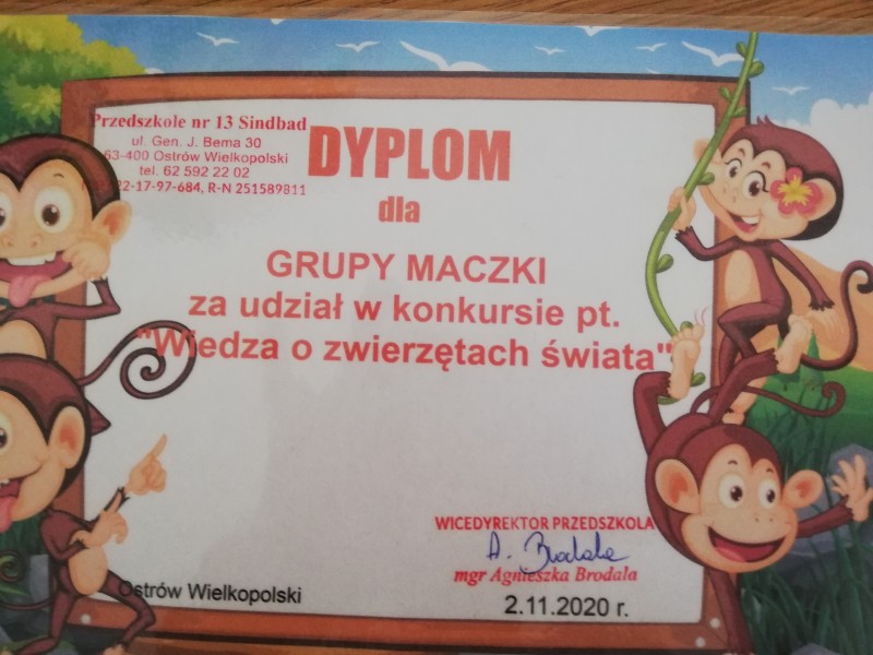 W poniedziaĹek 2 listopada MACZKI wziÄĹy udziaĹ w konkursie przedszkolnym na temat ZwierzÄta Ĺwiata. Konkurs wiÄ zaĹ siÄ z tematykÄ rozpoczÄtÄ w tamtym roku szkolnym. MACZKI na konkursie prezentowaĹy swojÄ wiedzÄ na temat zwierzÄ t kontynentu AZJI. RozwiÄ zywaĹy zagadki sĹowno-obrazkowe, rozpoznawaĹy i nazywaĹy zwierzÄta po ich cieniach, skĹadaĹy puzzle, nazywaĹy zwierzÄta Azji i nie tylko. W konkursie grupÄ reprezentowali: Kinga-Lily-Filip-Alan-Dominik, ktĂłrzy na koniec odebrali nagrody i dyplom udziaĹu dla wszystkich MaczkĂłw!!