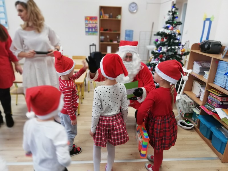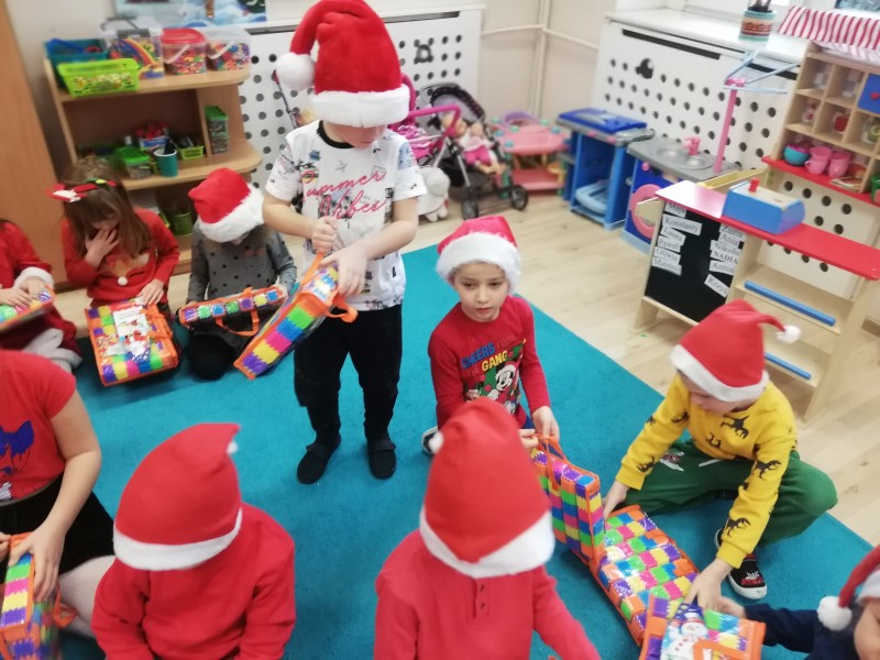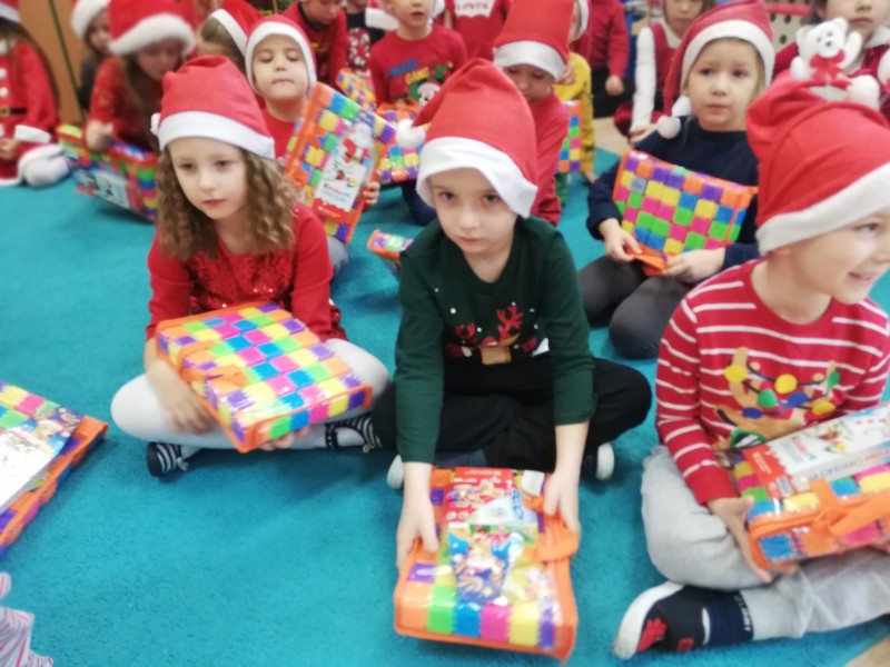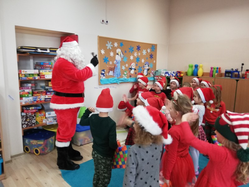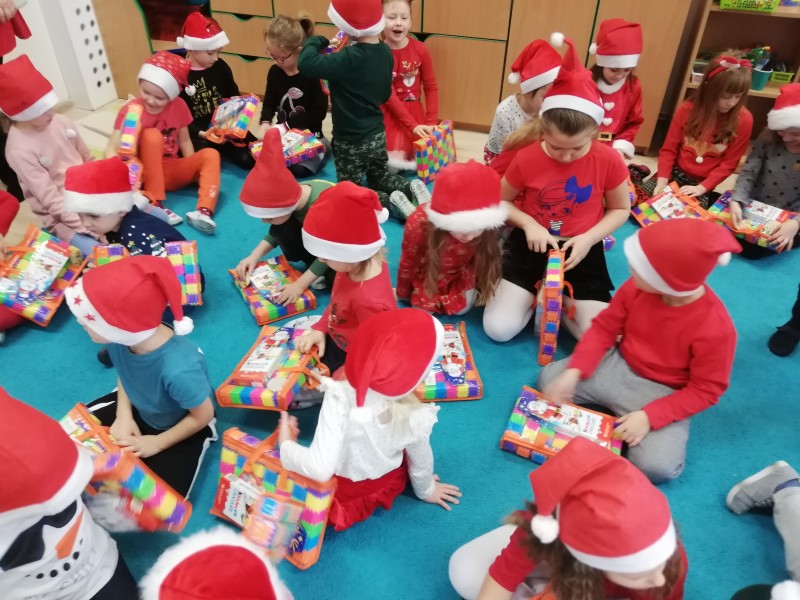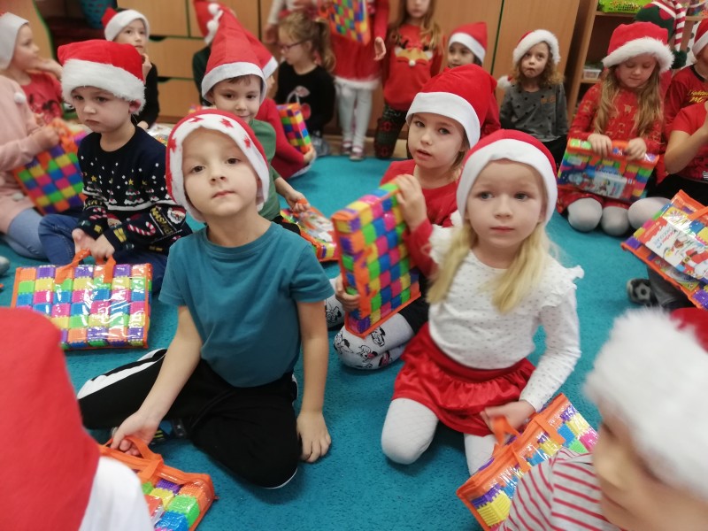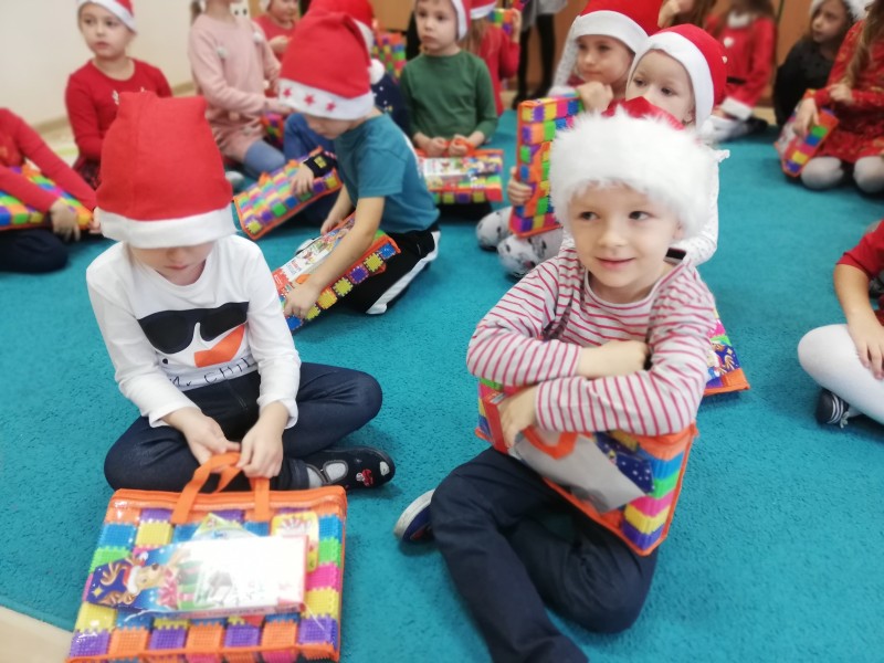MACZKI z duĹźÄ ciekawoĹciÄ oglÄ daĹy otrzymane prezenty i wymieniaĹy siÄ swoimi spostrzeĹźeniami. Dominik Sz. postanowiĹ osobiĹcie podziÄkowaÄ MikoĹajowi za otrzymany prezent. NastÄpnie dzieci wrÄczyĹy MikoĹajowi przygotowanÄ kartkÄ ĹwiÄ tecznÄ i prezent. Nasz GoĹÄ podziÄkowaĹ wszystkim dzieciom za miĹe spotkanie i powiedziaĹ, Ĺźe na niego juĹź pora. PoĹźegnaĹ wszystkie dzieci i wyruszyĹ w dalszÄ drogÄ.