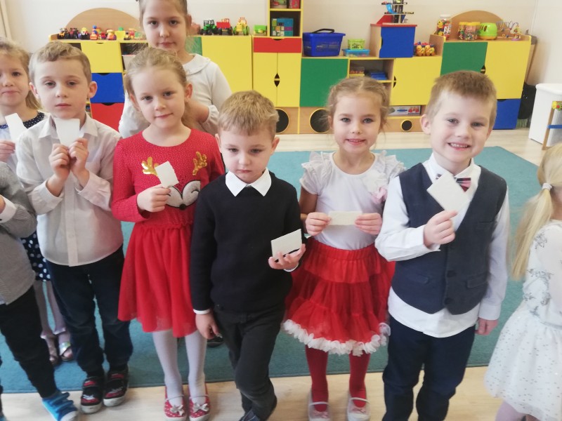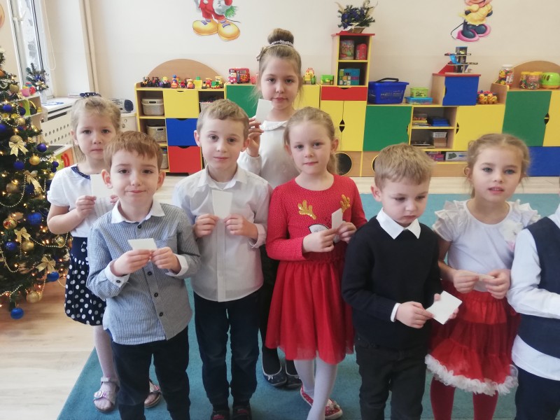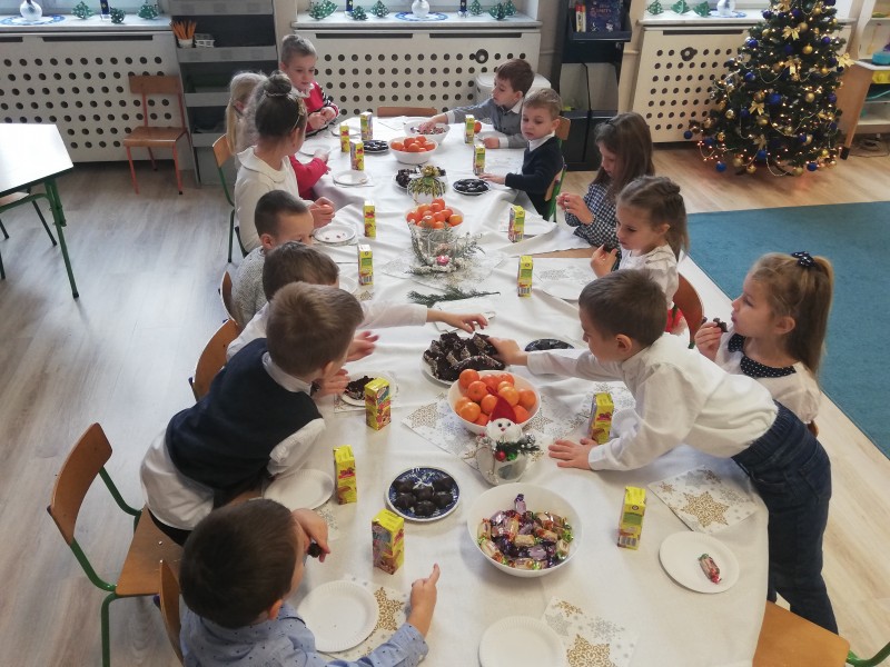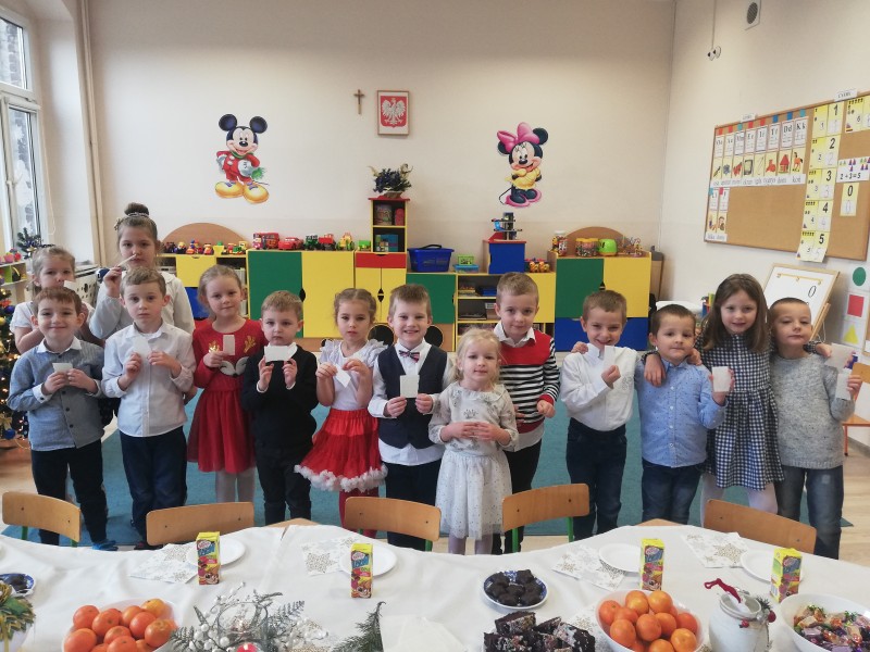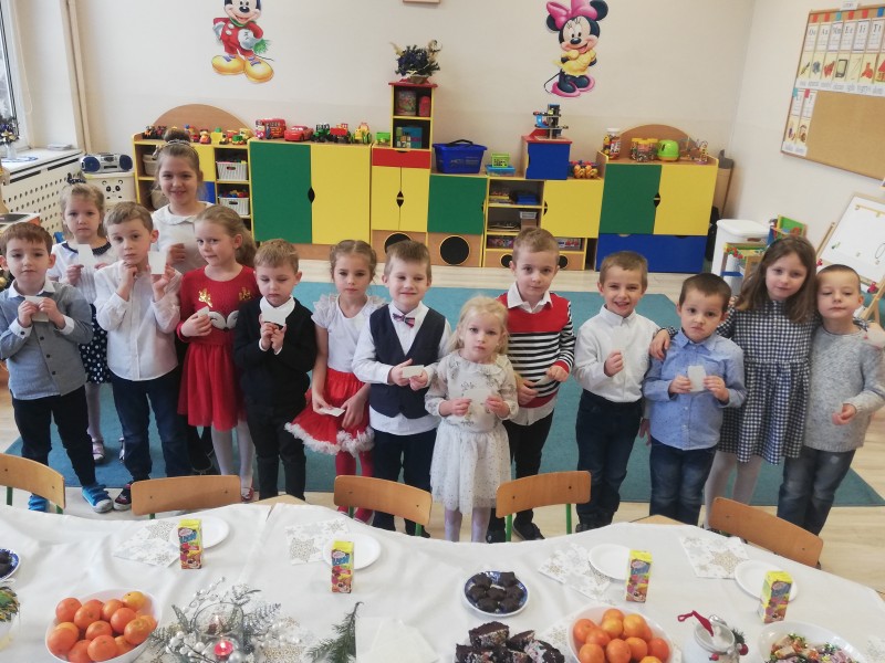 W piÄ tek 18 grudnia w grupie MACZKĂW odbyĹa siÄ uroczysta Wigilia. KaĹźde z dzieci trzymajÄ c opĹatek wysĹuchaĹy ĹźyczeĹ od swojej pani z okazki ĹwiÄ t BoĹźego Narodzenia. NastÄpnie dzieci dzielÄ c siÄ opĹatkiem zĹoĹźyĹy sobie nawzajem Ĺźyczenia - WesoĹych ĹwiÄ t! Po wzajemnych Ĺźyczeniach caĹa grupa zasiadĹa do wspĂłlnego stoĹu.