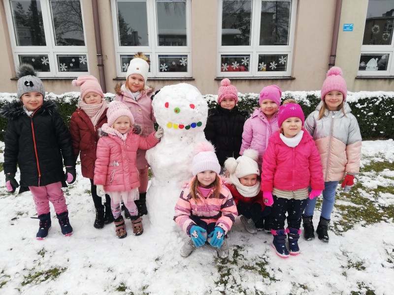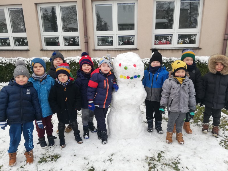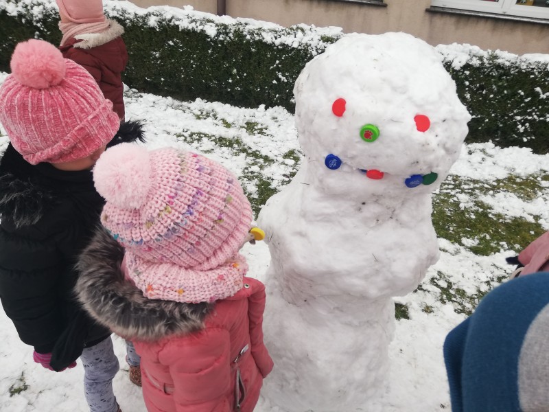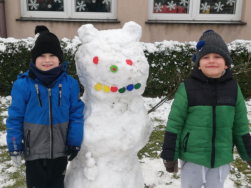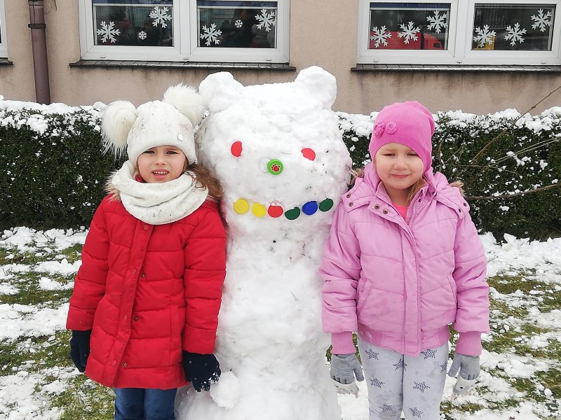 Z zabawy na Ĺniegu i toczeniu kĂłl Ĺniegowych MACZKI ulepiĹy BaĹwana. Później powstaĹ pomysĹ, aby dolepiÄ uszy i powstaĹ Ĺniegowy MiĹ. Na koniec zabaw dzieci zrobiĹy sobie zdjÄcie z BaĹwankiem Misiowym!