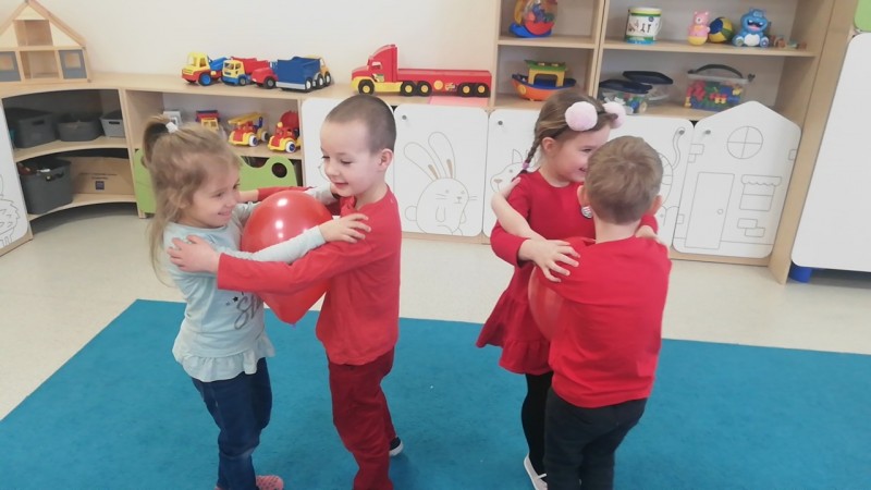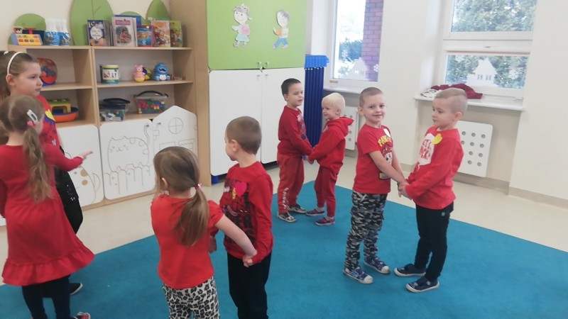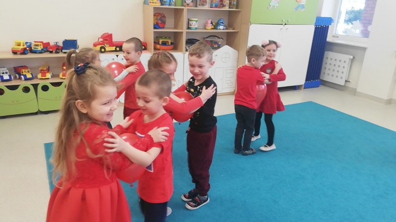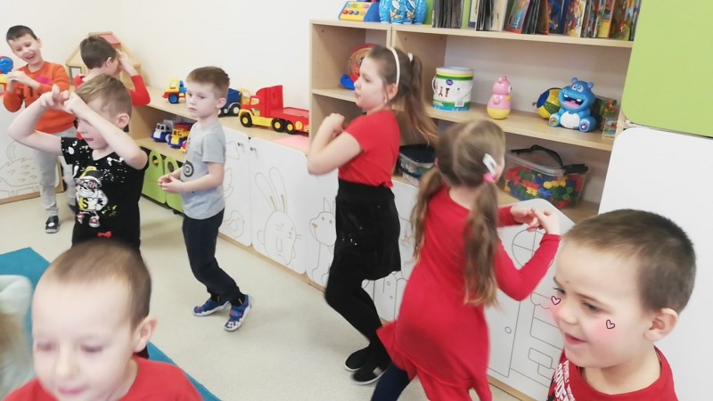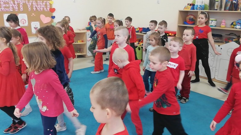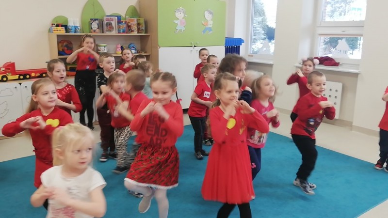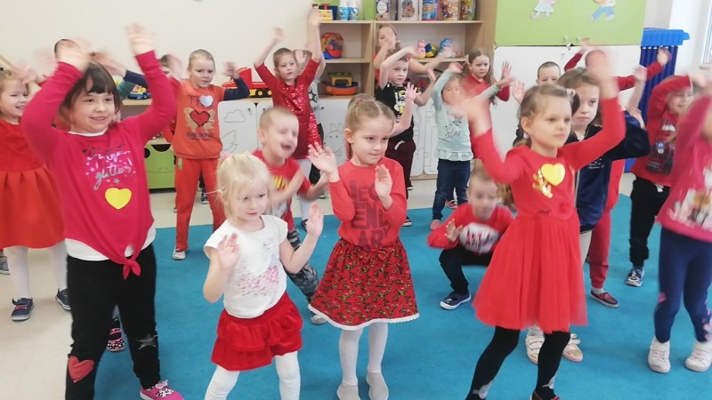 W dzieĹ Ĺw. Walentego nie zabrakĹo wspĂłlnych taĹcy do skocznej i rytmicznej muzyki. KaĹźde z dzieci wyginaĹo ĹmiaĹo ciaĹo i staraĹo siÄ naĹladowaÄ ruchy do zespoĹowych taĹcy. Zabawa sprawiaĹa MACZKOM wiele zadowolenia i radoĹci.