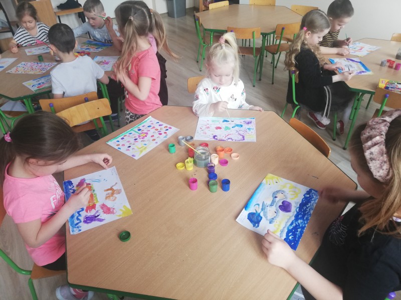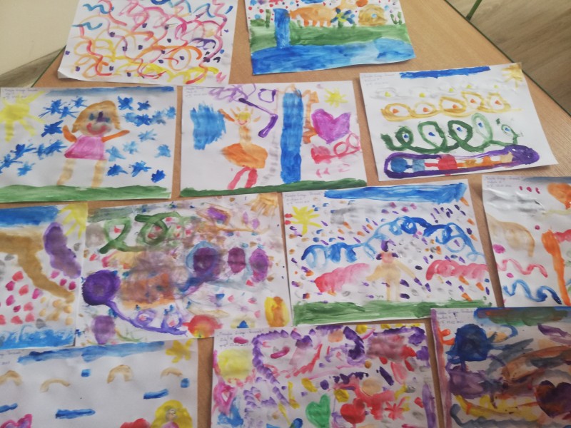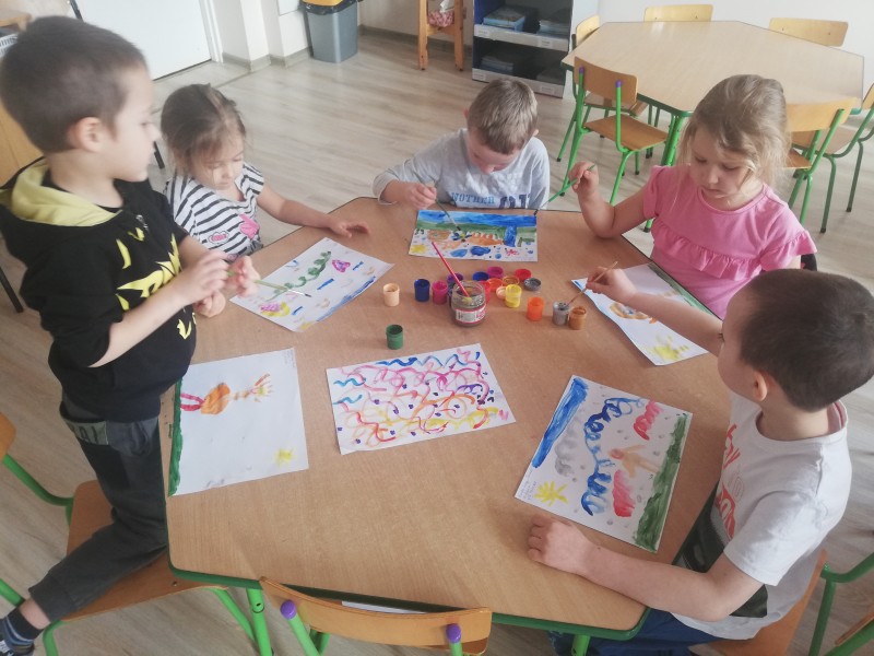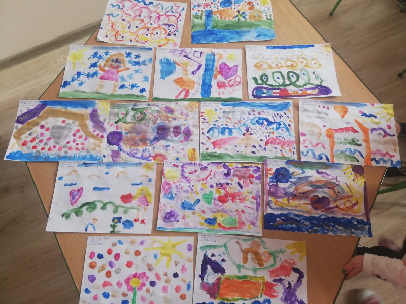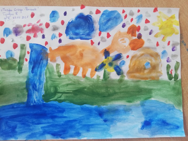 Miniony tydzieĹ u MACZKĂW obfitowaĹ w sĹuchanie róşnorodnej muzyki instrumentalnej. Dzieci poznaĹy gamÄ muzycznÄ , wartoĹÄ nut oraz kompozytorĂłw muzyki powaĹźnej: Chopina, Griega, Czajkowskiego. Dzieci namalowaĹy farbami utwĂłr ,,Poranek" Griega. WyraĹźaĹy swoje emocje, wraĹźenia sĹuchanej muzyki Griega. Prace wyszĹy wspaniale!!!