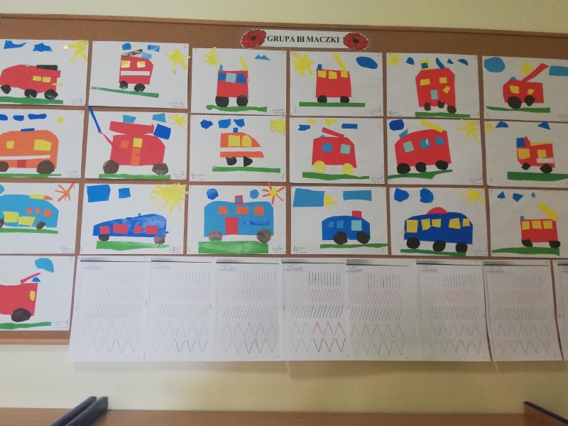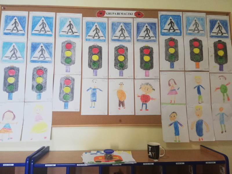 Wycieczka na pobliskie skrzyĹźowanie ulic uĹatwiĹy,,Maczkom"wykonaÄ prace plastyczne. Dzieci pokolorowaĹy znak drogowy, pomalowaĹy farbami sygnalizacjÄ ĹwietlnÄ oraz wyciÄĹy z kolorowego papieru pojazdy sĹuĹźb niosÄ cych pomoc (policja, straĹź poĹźarna, pogotowie ratunkowe). Przy tej okazji utrwaliĹy sobie znajomoĹÄ numerĂłw alarmowych.