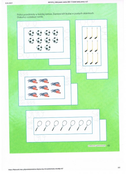 * policz przedmioty sportowe w kaĹźdej ramce, zaznacz oĹĂłwkiem liczbÄ odpowiedniÄ cyfrÄ (6 latki