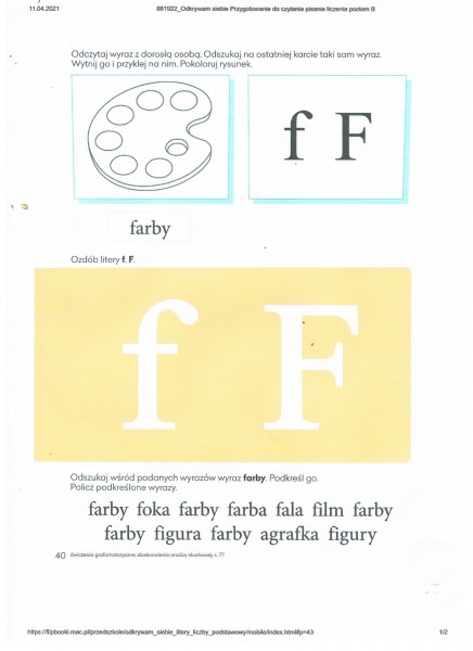 * zaznaczcie we wszystkich sylabach i wyrazach literkÄ f kredkÄ niebieskÄ