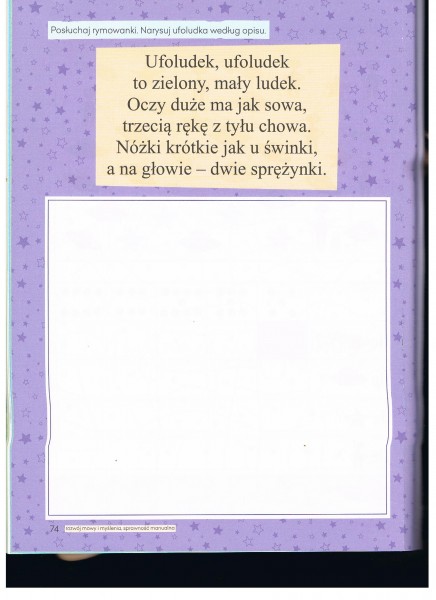 * posĹuchaj rymowanki przeczytanej przez rodzica, narysuj kredkami ufoludka wg sĹĂłw rymowanki. Powodzenia!