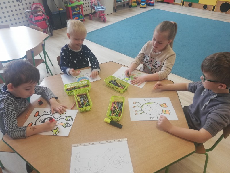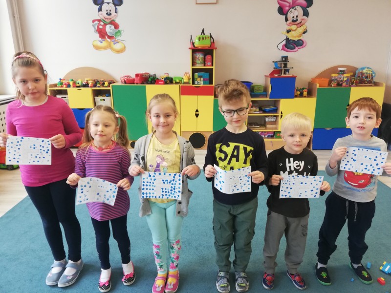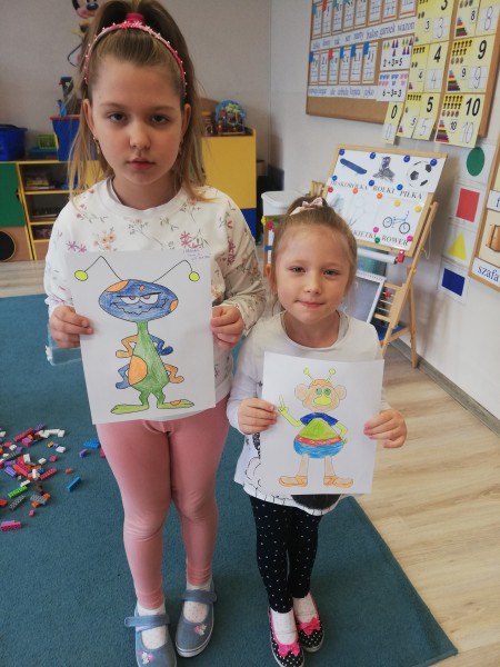 wypeĹnili falami kreĹlonymi oĹĂłwkiem i otoczyli niebieskimi stemplami palcowymi. Kolejne dni dzieci poznawaĹy nieznany wszechĹwiat , znajdujÄ