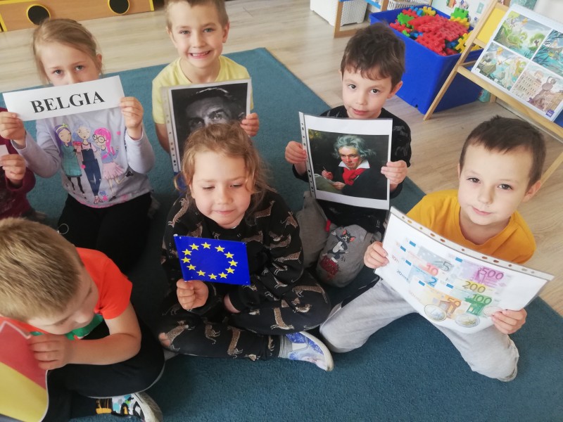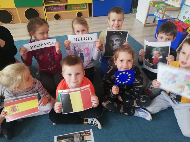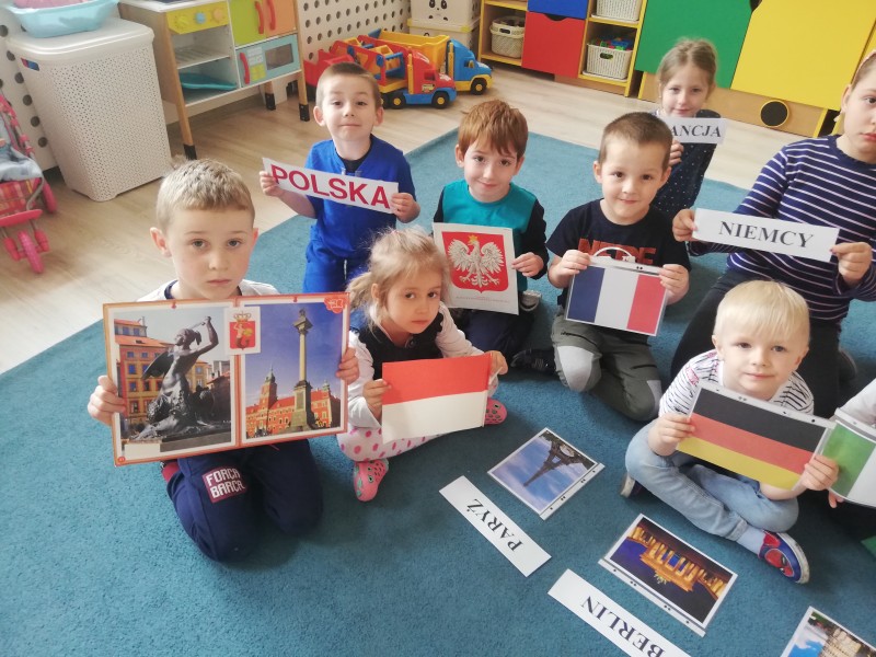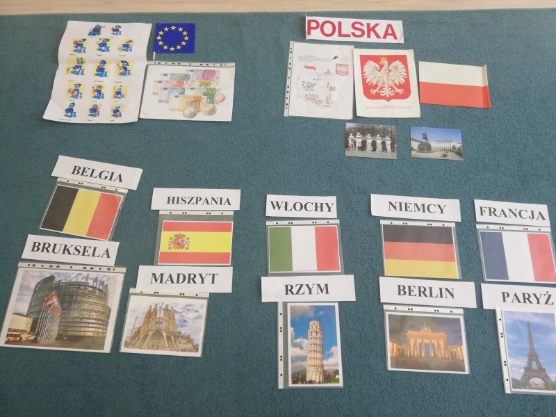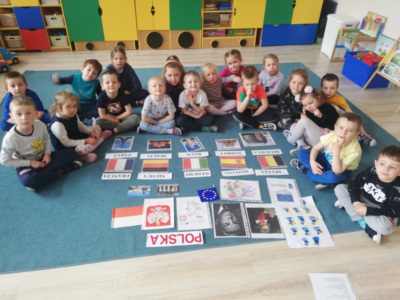 MACZKI przed weekendem majowym, ktĂłry obfituje w ĹwiÄta narodowe miaĹy okazjÄ zapoznaÄ siÄ z symbolami, hymnem, walutom i charakterystycznymi zabytkami krajĂłw naleĹźÄ cych do Unii Europejskiej (Francja-WĹochy-Hiszpania-Niemcy-Belgia-Polska). DowiedziaĹy siÄ jak moĹźna przywitaÄ siÄ w kilku jÄzykach europejskich. PoznaĹy historiÄ i zasady utworzenia wspĂłlnoty europejskiej. ChoÄ trudno byĹo zapamiÄtaÄ flagi, nazwy krajĂłw i ich stolic to zainteresowanie i ciekawoĹÄ byĹa duĹźa. Na koniec zajÄÄ MACZKI zaĹpiewaĹy hymn narodowy MAZUREK DÄBROWSKIEGO