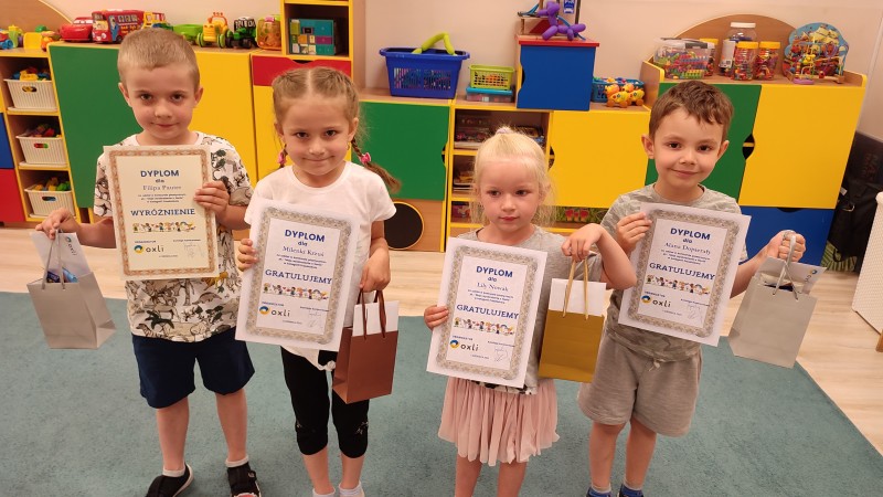 . W naszej grupie w konkursie wyróşniony zostaĹ Filip. P i nagrodzony, pozostaĹe dzieci zostaĹy takĹźe nagrodzone za udziaĹ bardzo piÄknymi prezentami. GRATULACJE DLA NASZYCH LAUREATĂW. BRAWO!!