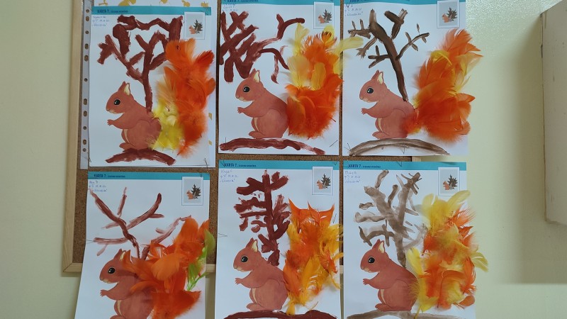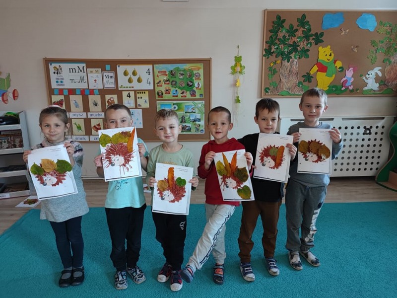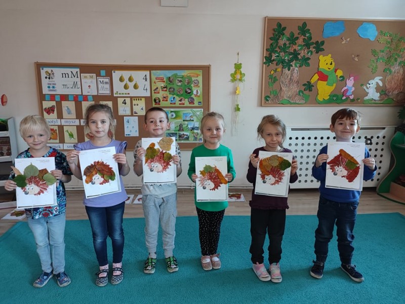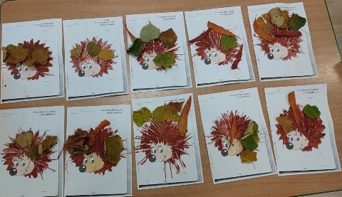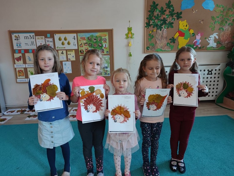 c wiewiĂłrkÄ i jeĹźa przepiÄknymi barwami jesieni. Wykorzystali do tego piĂłrka w odcieniach pomaraĹczowych, zielonych i şóĹtych oraz przecudne liĹcie zebrane na spacerze jesiennym.