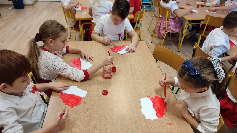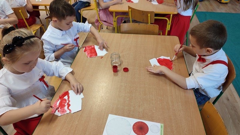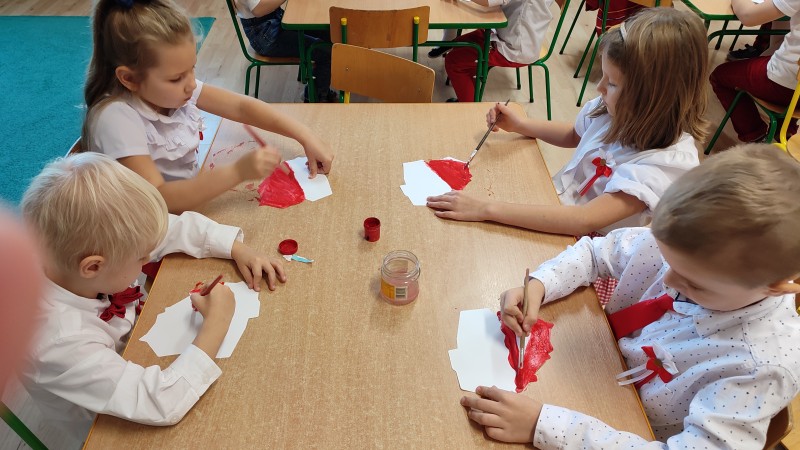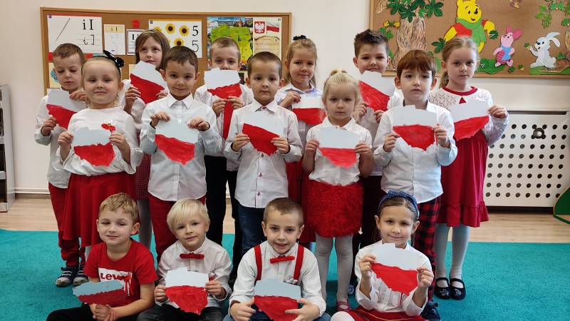 MACZKI przygotowujÄ c siÄ do ĹWWIÄTA NIEPODLEGĹOĹCI przyszli do przedszkola ubrani w barwy narodowe oraz pomalowali czerwonÄ farbÄ kontur Polski. Swoim strojem oraz wykonanÄ pracÄ plastycznÄ MACZKI wyrazili w ten sposĂłb swojÄ miĹoĹÄ i przywiÄ zanie do OJCZYZNY!!!