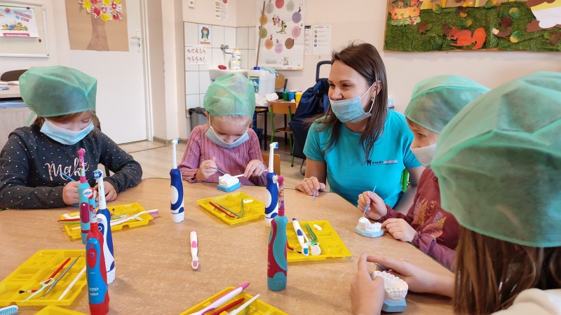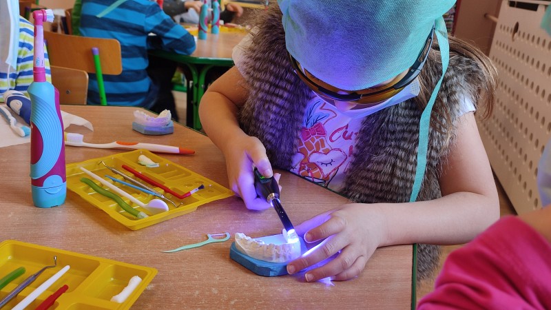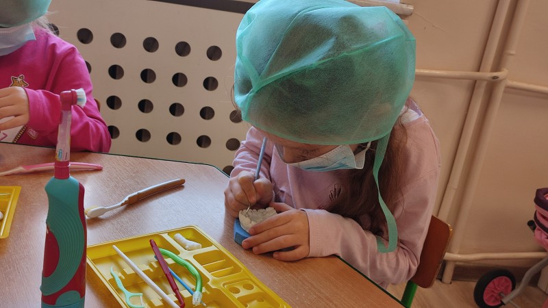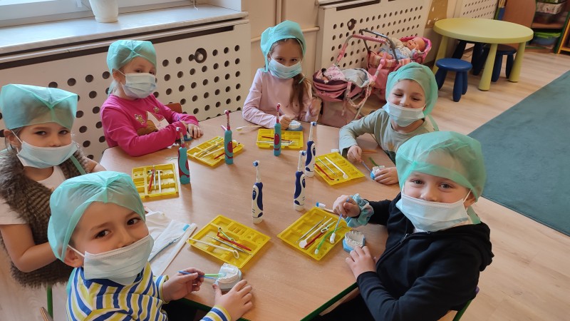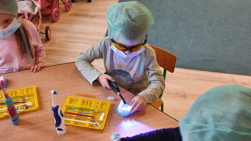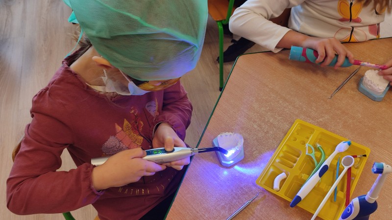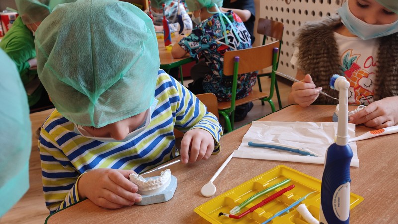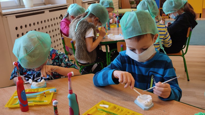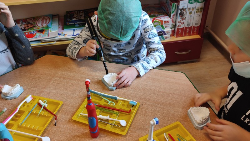ZdobytÄ wiedzÄ stomatologicznÄ od Pani Dudy MACZKI miaĹy okazjÄ zastosowaÄ w praktyce. Samodzielnie czyĹciĹy zÄby, lakierowaĹy zÄby, wypeĹniaĹy zÄby plombami i utrwardzaĹy specjalnymi lampami. Przy tej okazji dzieci mogĹy operowaÄ narzÄdziami stomatologicznymi. Do tego zadania MACZKI podeszĹy z duĹźym zaangaĹźowaniem i cierpliwoĹciÄ .