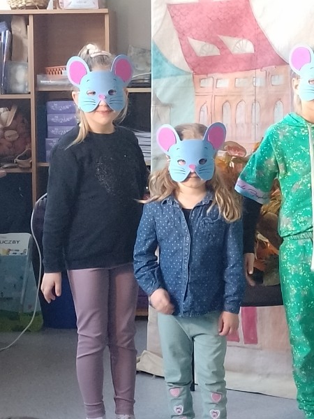 Dziewczynki Oliwia i Elizka chÄtnie zgĹosiĹy siÄ i zagraĹy rolÄ myszek.