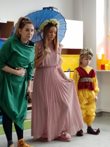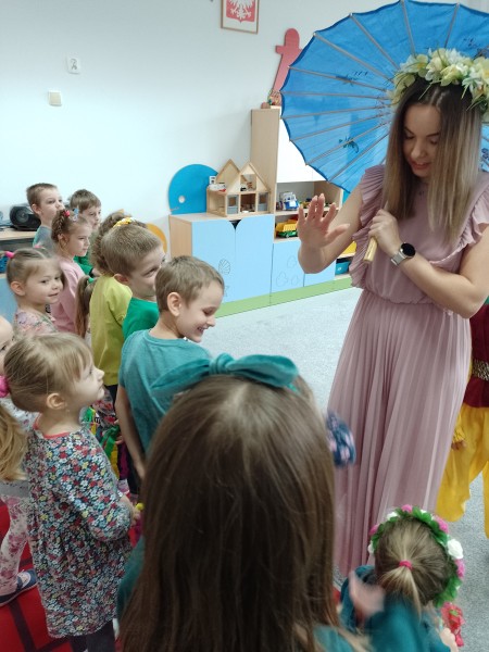Stokrotki wraz ze wszystkimi grupami obchodziĹy Pierwszy DzieĹ Wiosny. SpotkaliĹmy siÄ w naszej sali, do ktĂłrej przybyli niespodziewani goĹcie: Sindbad i pani Wiosna.