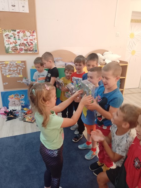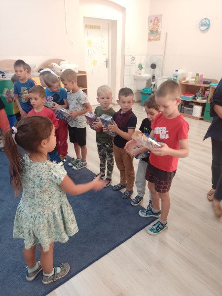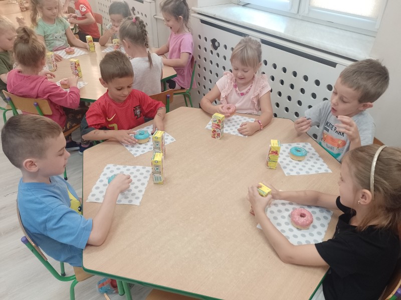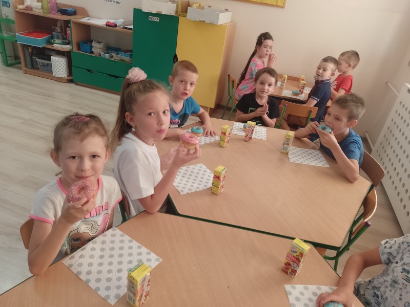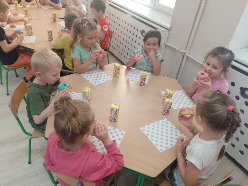 Dziewczynki zaĹpiewaĹy kolegom Sto lat i wrÄczyĹy upominki, nastÄpnie wszyscy z apetytem zjedli babeczkowe donaty.