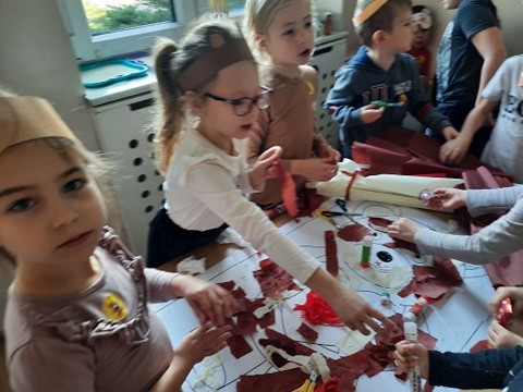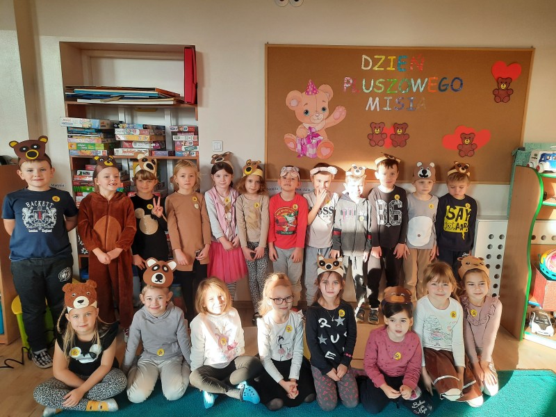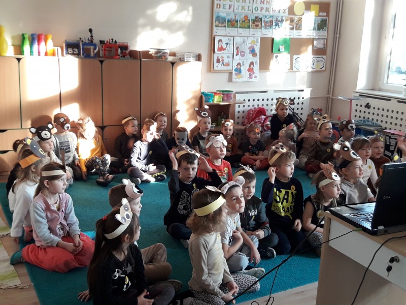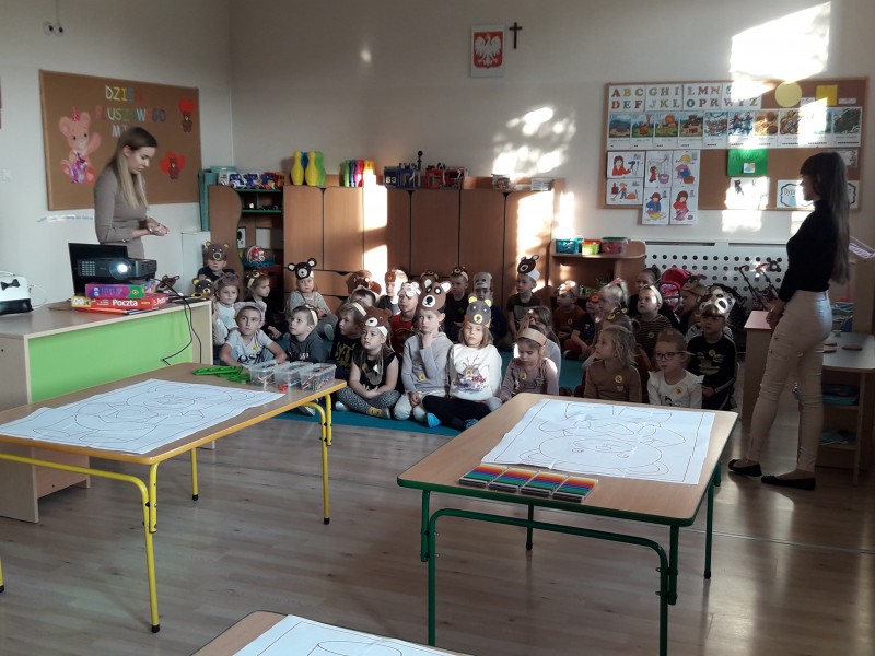 25 listopada obchodziliĹmy w przedszkolu "DzieĹ Pluszowego Misia". P. Ania i P. Patrycja przygotowaĹy z tej okazji dla dzieci prezentacje multimedialnÄ , a na koniec dzieci zataĹczyĹy do piosenki "Gummy bear". Na koniec kaĹźda z grup, miaĹa za zadanie wypeĹniÄ kontur misia róşnymi technikami plastycznymi. Stokrotki wykonaĹy misia z bibuĹy.