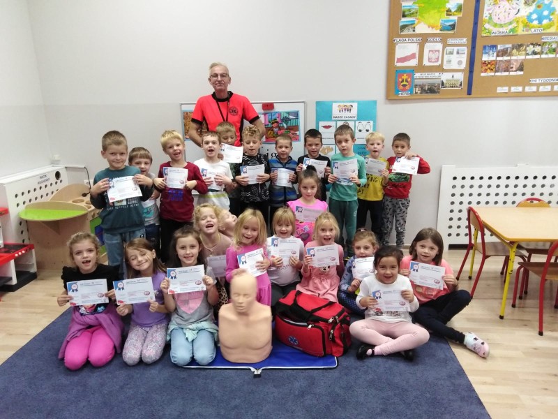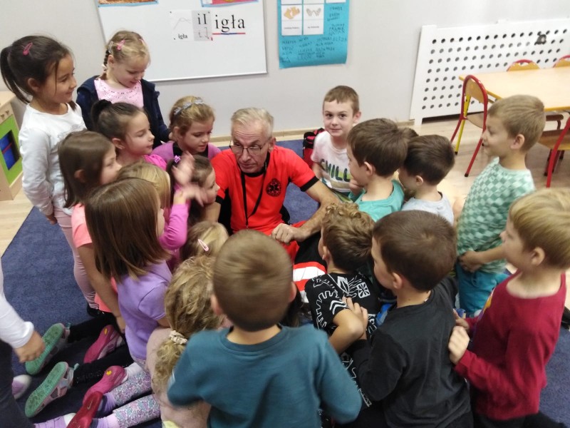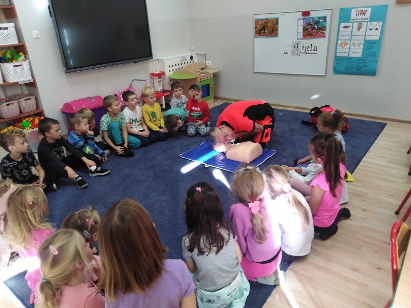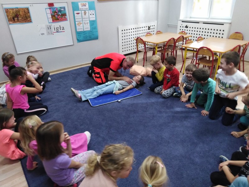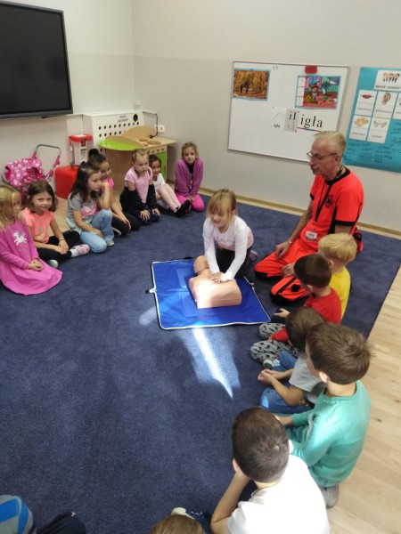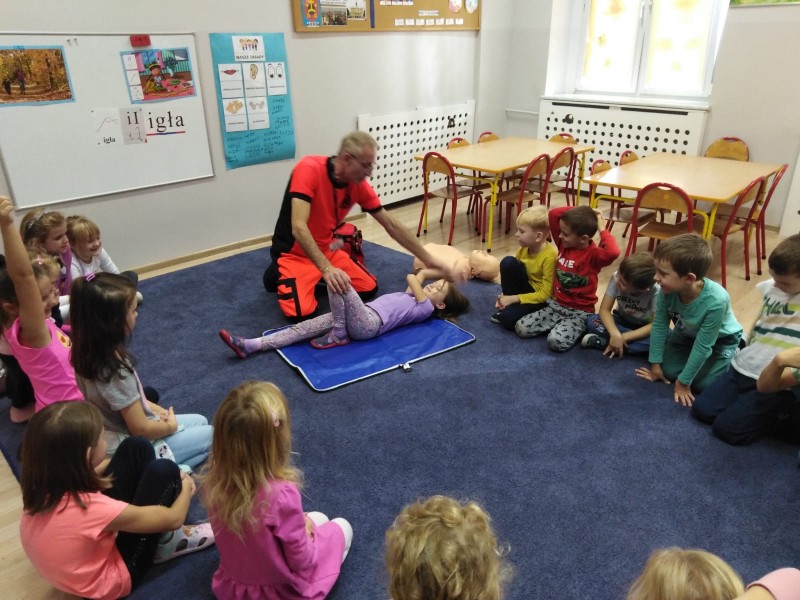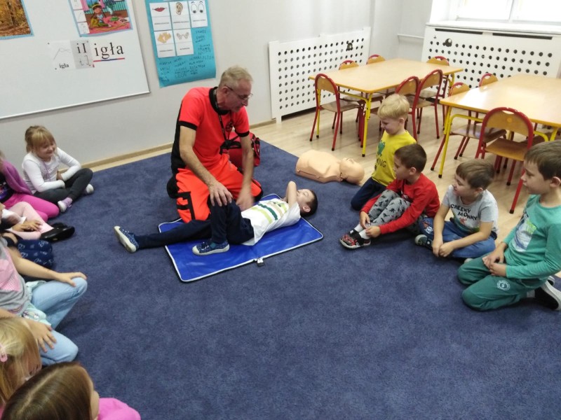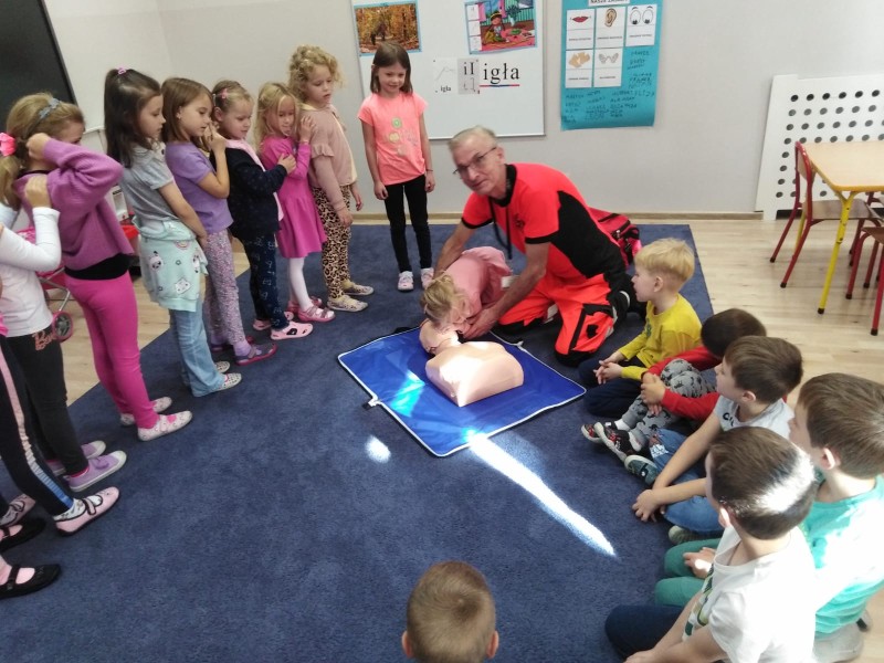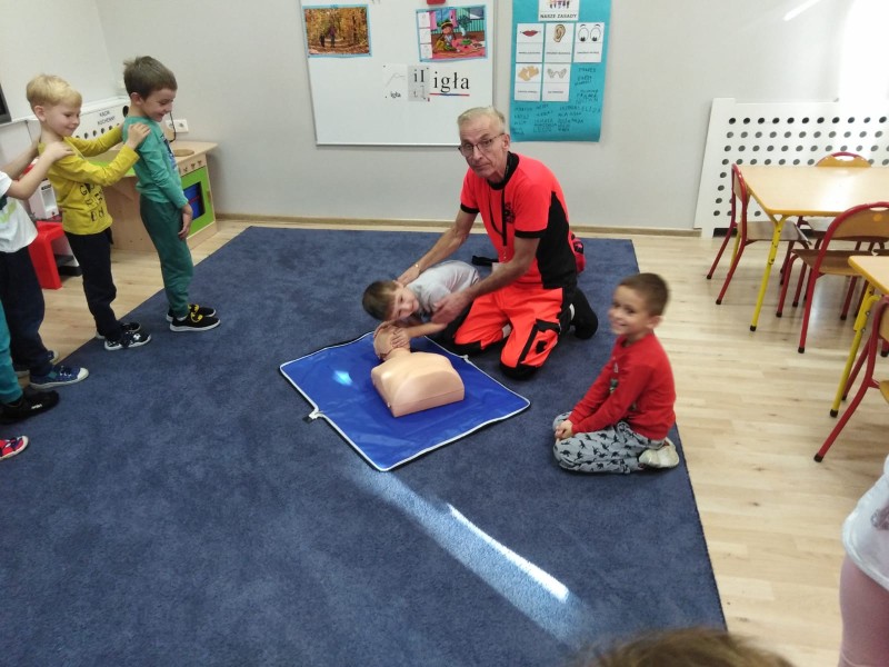 Dzisiaj przedszkole odwiedziĹ ratownik medyczny, Stokrotki odĹwieĹźyĹy sobie wiedzÄ z zakresu pierwszej pomocy.