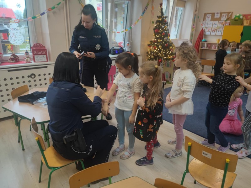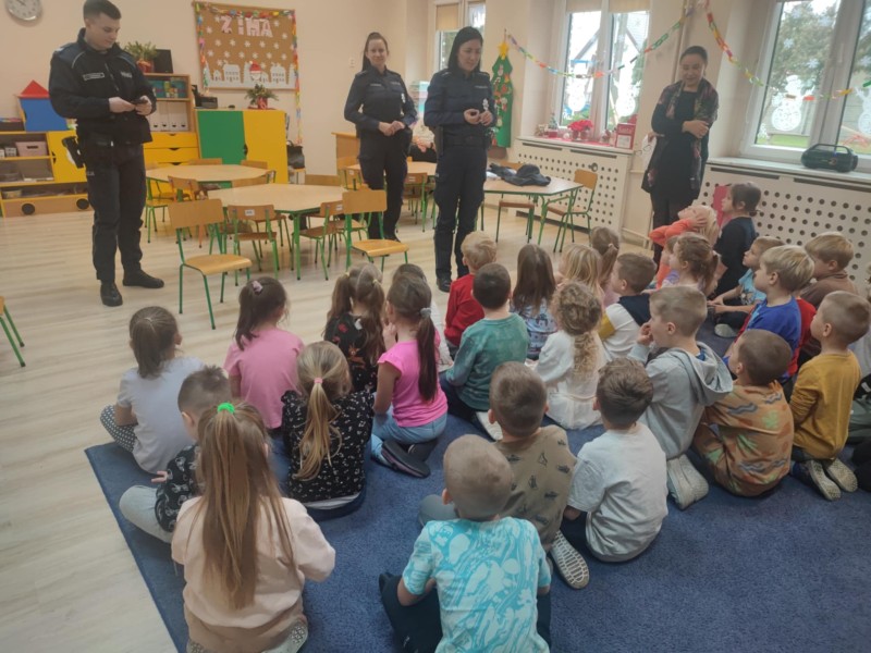 Nasze przedszkole odwiedziĹy policjantki, ktĂłre opowiedziaĹy nam o swojej pracy. PokazaĹy nam wyposaĹźenie kaĹźdego policjanta oraz opowiedziaĹy o bezpiecznym poruszaniu siÄ zarĂłwno pieszo, jak i samochodem (fotelik i zapiÄcie pasĂłw).
