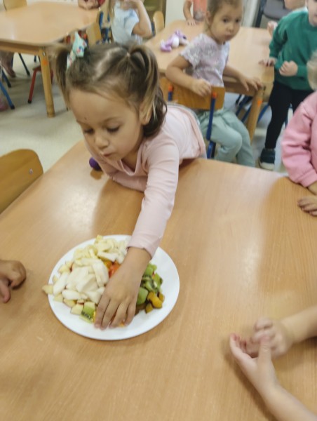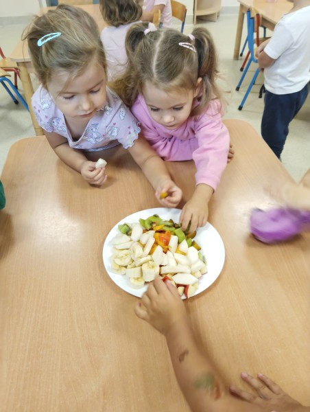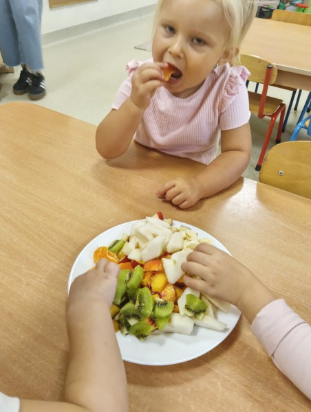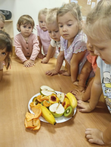 Podczas zajÄÄ Stokrotki zaglÄ daĹy wewnÄ trz owocĂłw. SprawdzaliĹmy co w Ĺrodku znajdziemy, a nastÄpnie chÄtne dzieci prĂłbowaĹy smaki owocĂłw.