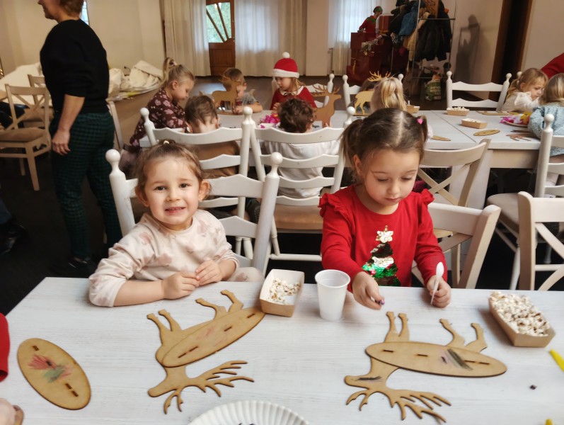 Podczas warsztatĂłw plastycznych dzieci stworzyĹy wĹasne, kolorowe, ĹwiÄ teczne renifery.