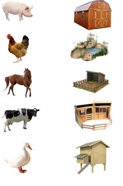 ZdjÄcia: krowy, kury, konia, kaczki, Ĺwini oraz ich domĂłw.