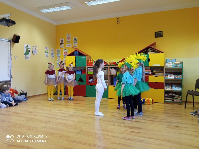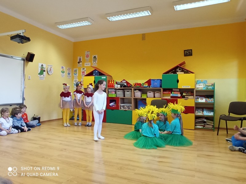 Dwie grupy, Usmieszki i SĹoneczka zaprosiĹy nas na przygotowane przez siebie wystepy. UĹmieszki wystÄ piĹy przed nami w amerykaĹskim taĹcu wykonanym z ogromnym zaangaĹźowaniem, natomiast SĹoneczka zagraĹy piÄkne wielkanocne przedstawienie.