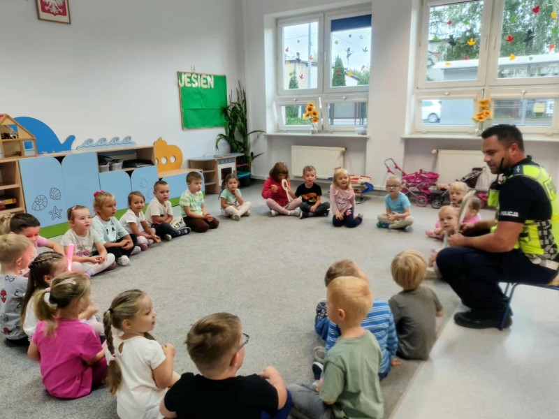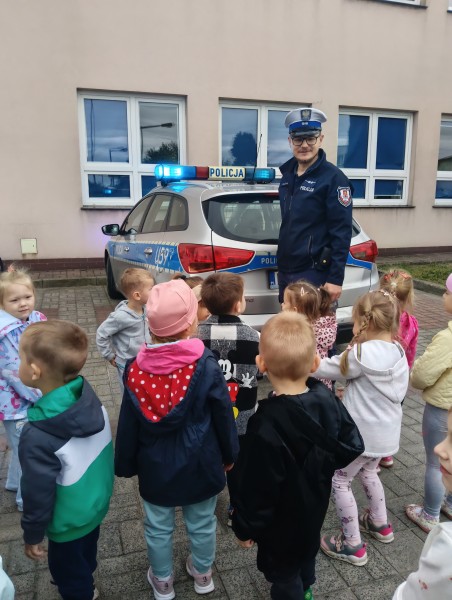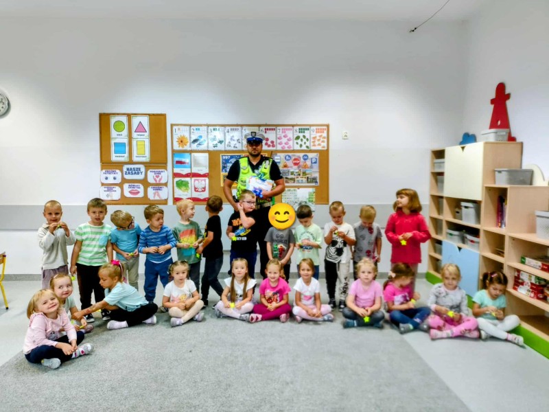 Opowiedzieli nam o swojej pracy, zaprezentowali elementy wyposaĹźenia i umundurowania Funkcjonariusza Policji oraz przypomnieli podstawowe zasady bezpieczeĹstwa w ruchu drogowym. Dzieci dowiedziaĹy siÄ jak duĹźe znaczenie dla bezpieczeĹstwa majÄ elementy odblaskowe.