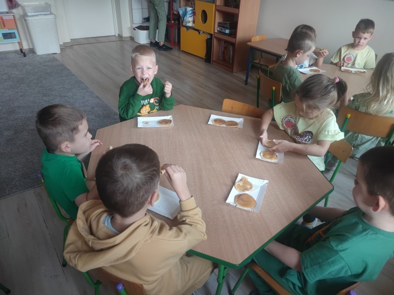 Dzieci miaĹy okazjÄ poznaÄ sposoby przetwarzania jabĹek. ByĹy soki z jabĹek, naleĹniki z musem jabĹkowym, dzieci prĂłbowaĹy suszone jabĹka oraz ĹwieĹźe.