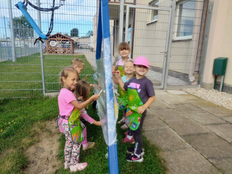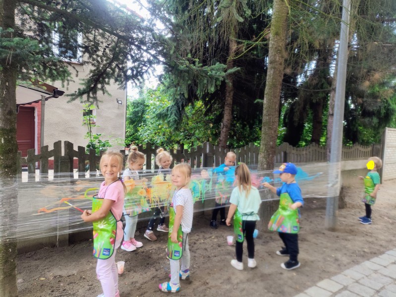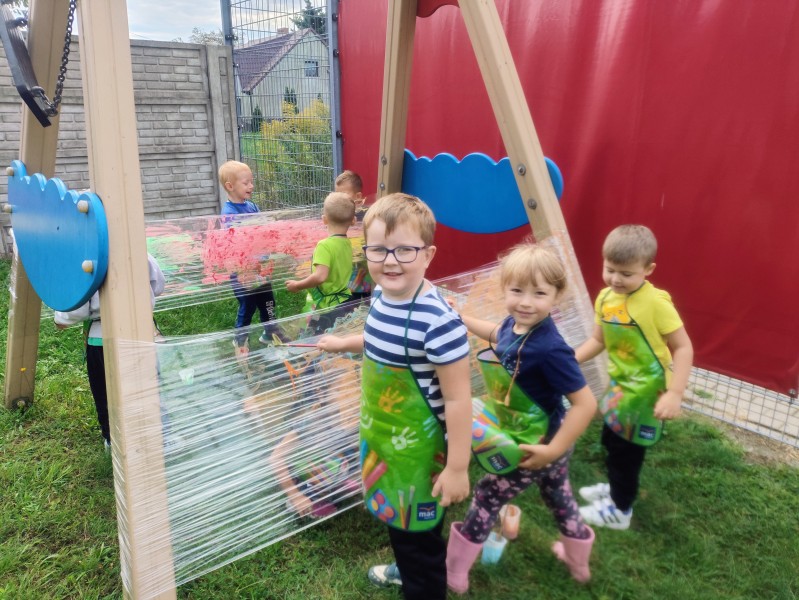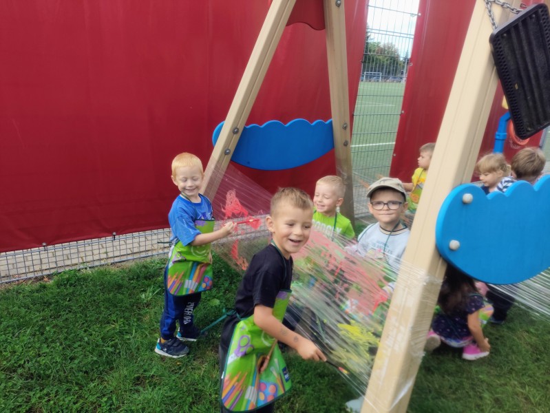 Mali artyĹci mieli moĹźliwoĹÄ zdobyÄ nowe doĹwiadczenie, podczas wspĂłlnego malowania farbami na folii stretch umieszczonej miÄdzy drzewami i sprzÄtami na przedszkolnym placu zabaw. Podczas aktywnoĹci doskonaliliĹmy motorykÄ maĹÄ , koordynacjÄ wzrokowo-ruchowÄ , stymulowaliĹmy zmysĹy, rozwijaliĹmy kreatywnoĹÄ i wyobraĹşniÄ, a takĹźe umiejÄtnoĹci wspĂłĹpracy w grupie rĂłwieĹniczej.