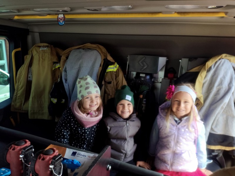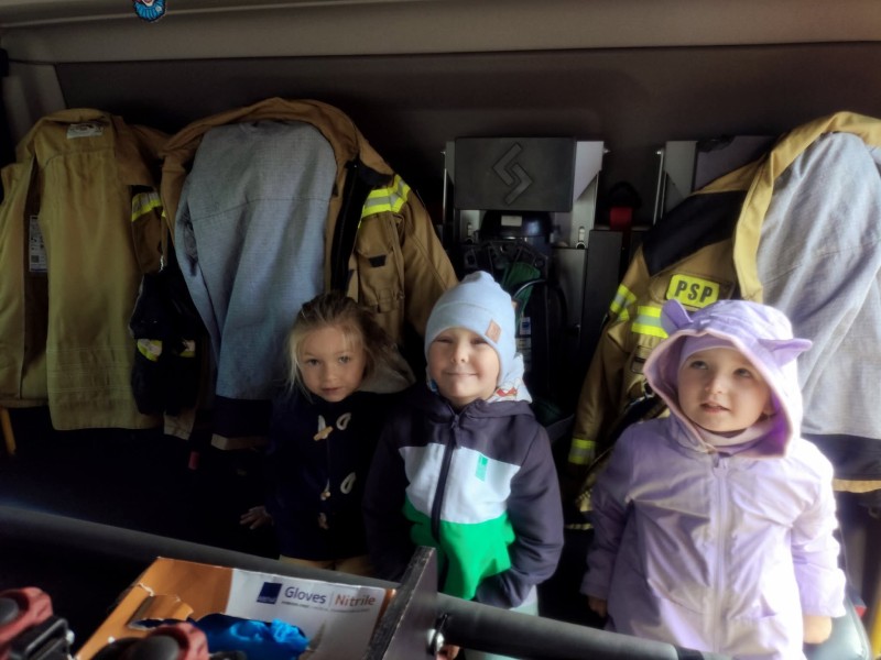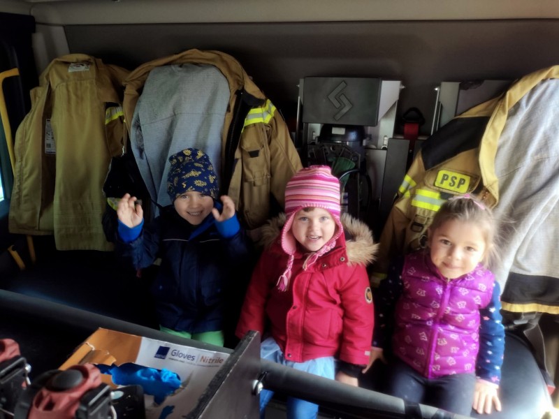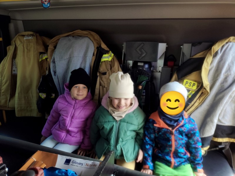 Przybyli na miejsce prĂłbnego alarmu przeciwpoĹźarowego straĹźacy z Komendy Powiatowej StraĹźy PoĹźarnej w Ostrowie Wielkopolskim zaprosili nas do wozu straĹźackiego đ. Dzieci byĹy zachwycone ;)