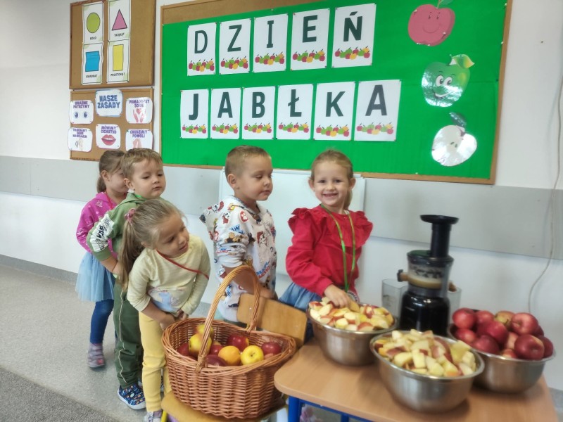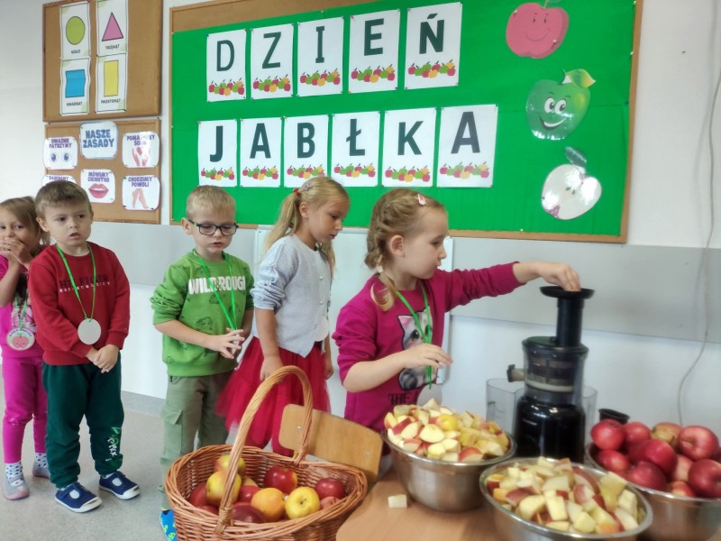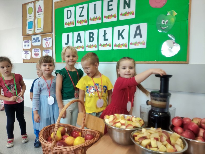 Dzieci samodzielnie przygotowaĹy przepyszny, zdrowy sok jabĹkowy, ktĂłry z apetytem wypiĹy. Dzieci miaĹy okazjÄ skosztowaÄ pysznych i soczystych jabĹuszek oraz jabĹkowych produktĂłw i przetworĂłw - musu i jabĹek suszonych.