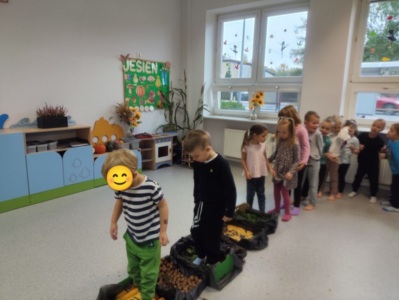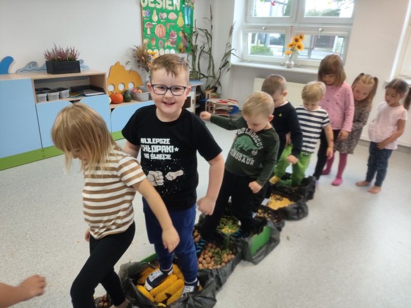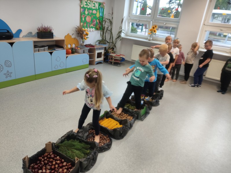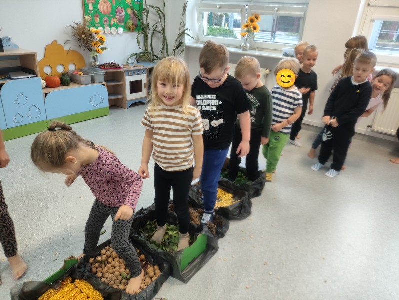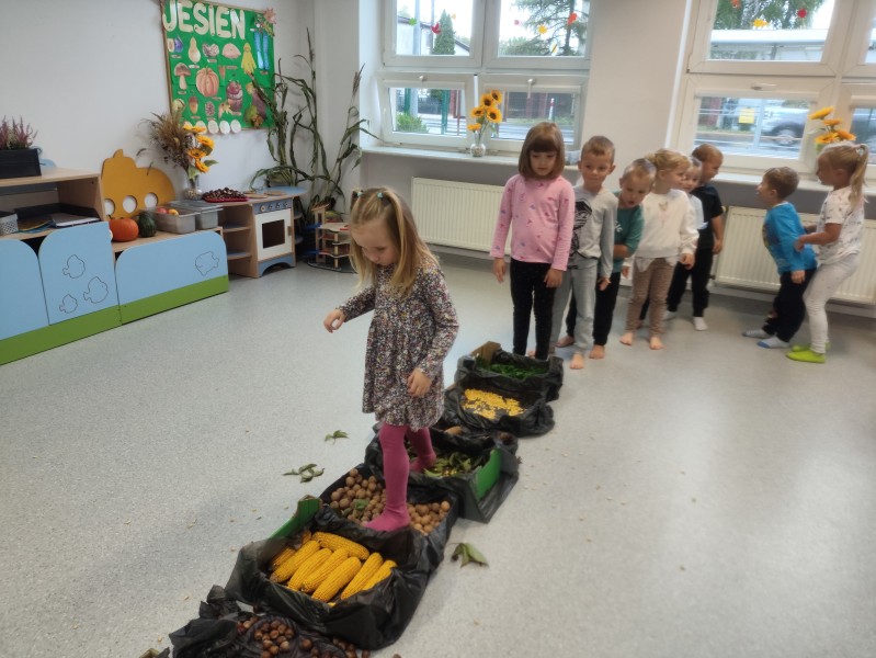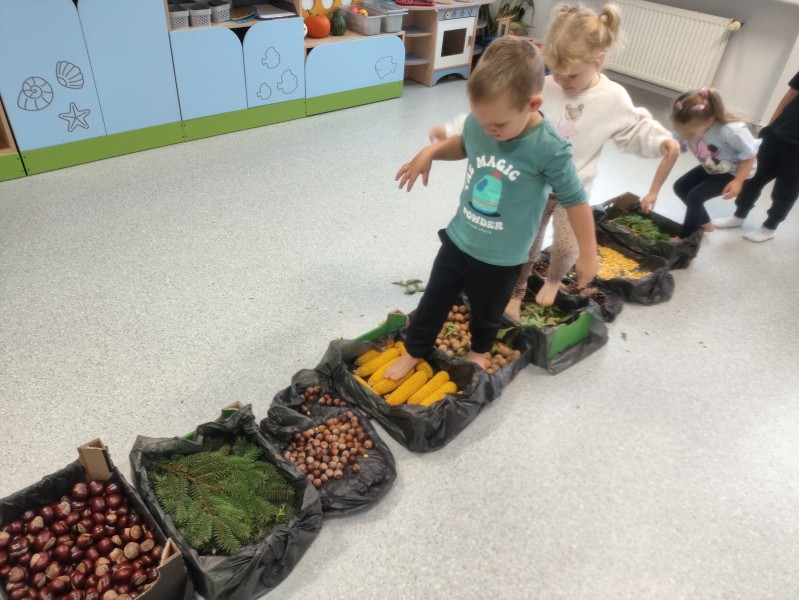 Dzieci przeszĹy miÄdzy innymi po miÄkkich liĹciach, delikatnych ziarnach kukurydzy, miÄkkich i twardszych szyszkach, kasztanach, ĹźoĹÄdziach, orzechach wĹoskich, kolbach kukurydzy, a nawet po kĹujÄ cych gaĹÄ zkach Ĺwierku.