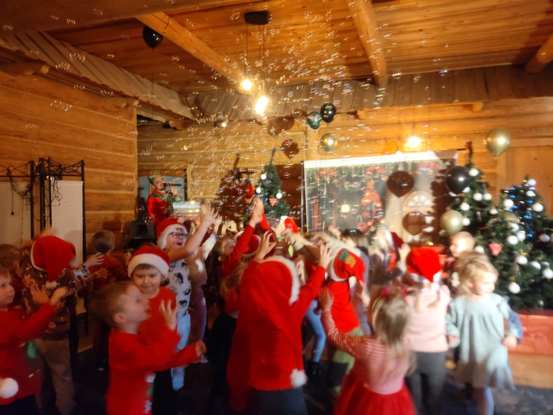 Radosne tańce z Mikołajem i Elfem wśród wirujących baniek mydlanych i płatków śniegu sprawiły, że każdy poczuł się częścią zimowej opowieści ❄️.